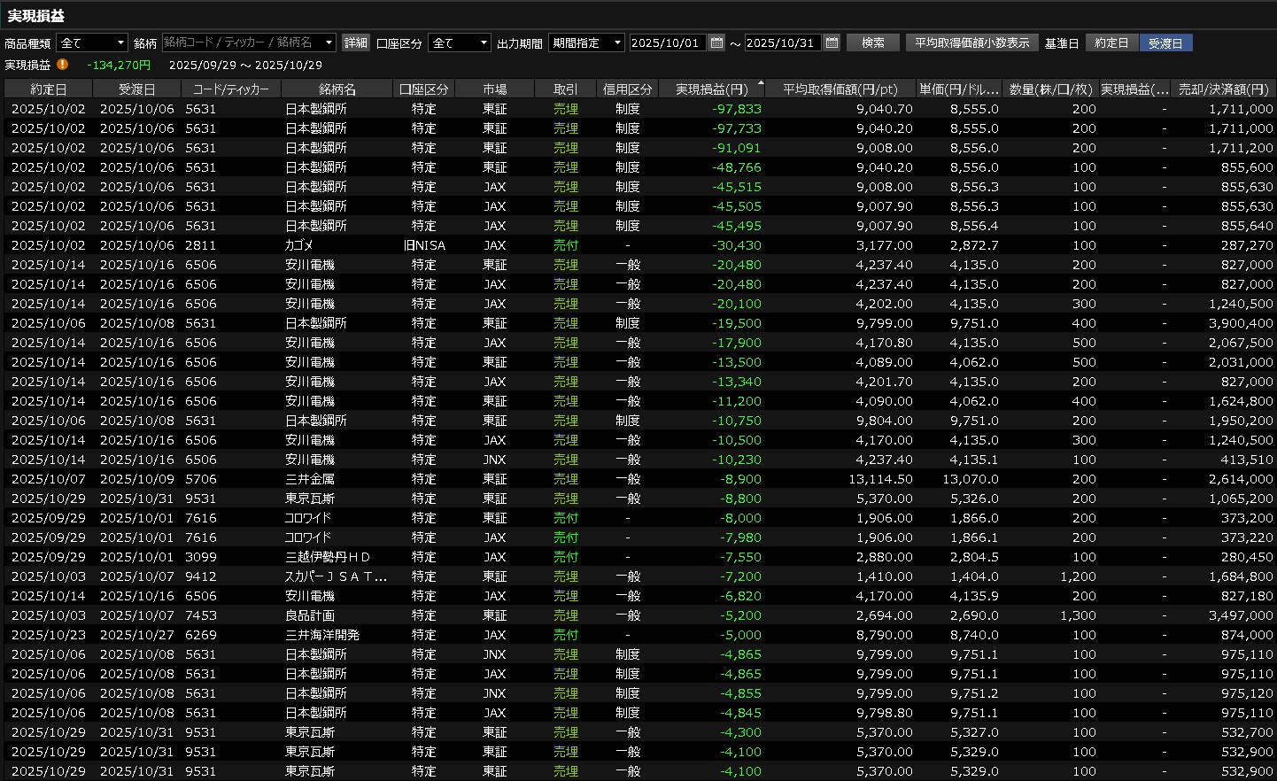 とにかく日本製鋼所<5631>にやられた10月でした。高市銘柄として強かったのですが、総裁選で小泉が勝つと思って泣く泣くロスカット・・・9000円で信用1000株。これがまさかの高市さんが総裁になって1万円超えたんやで・・・え!!!って感じですわ。自民党で民意が読めてないのはバカ議員ばかり・・・そしてそれはワイもでした。大いに反省です。またまたマスコミに踊らされた。もうねコメンテーターとか恥ずかしくないの?っていうレベルですね。ワイもですが・・・(´;ω;`)シクシク