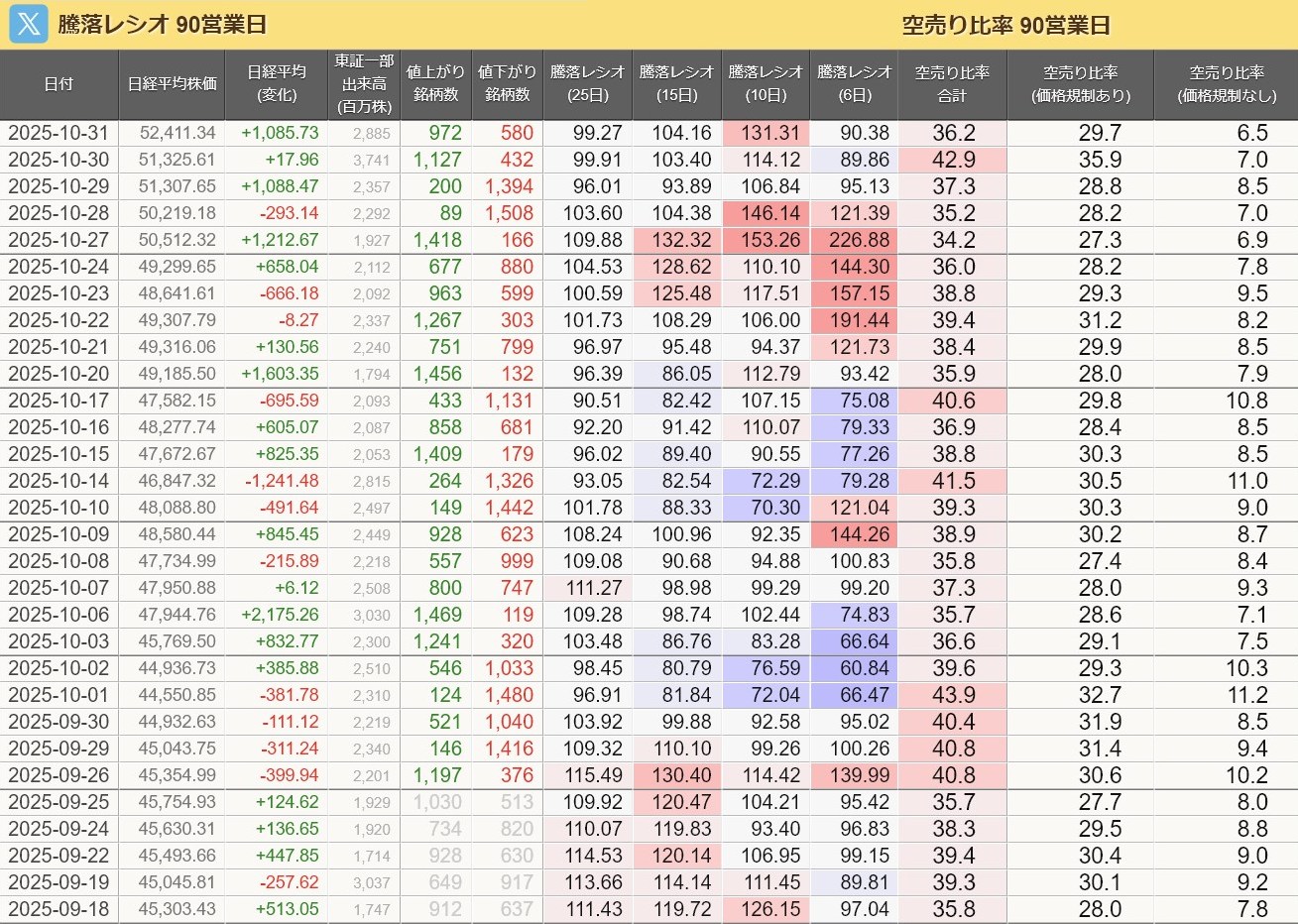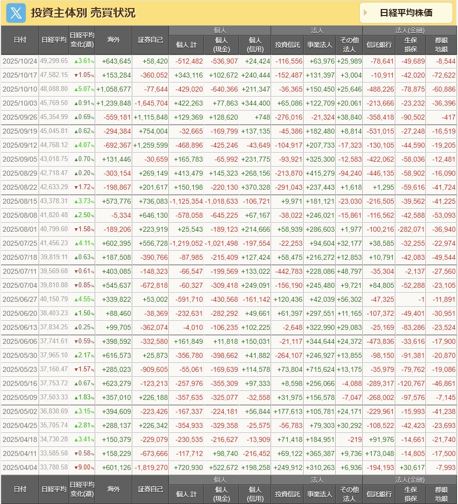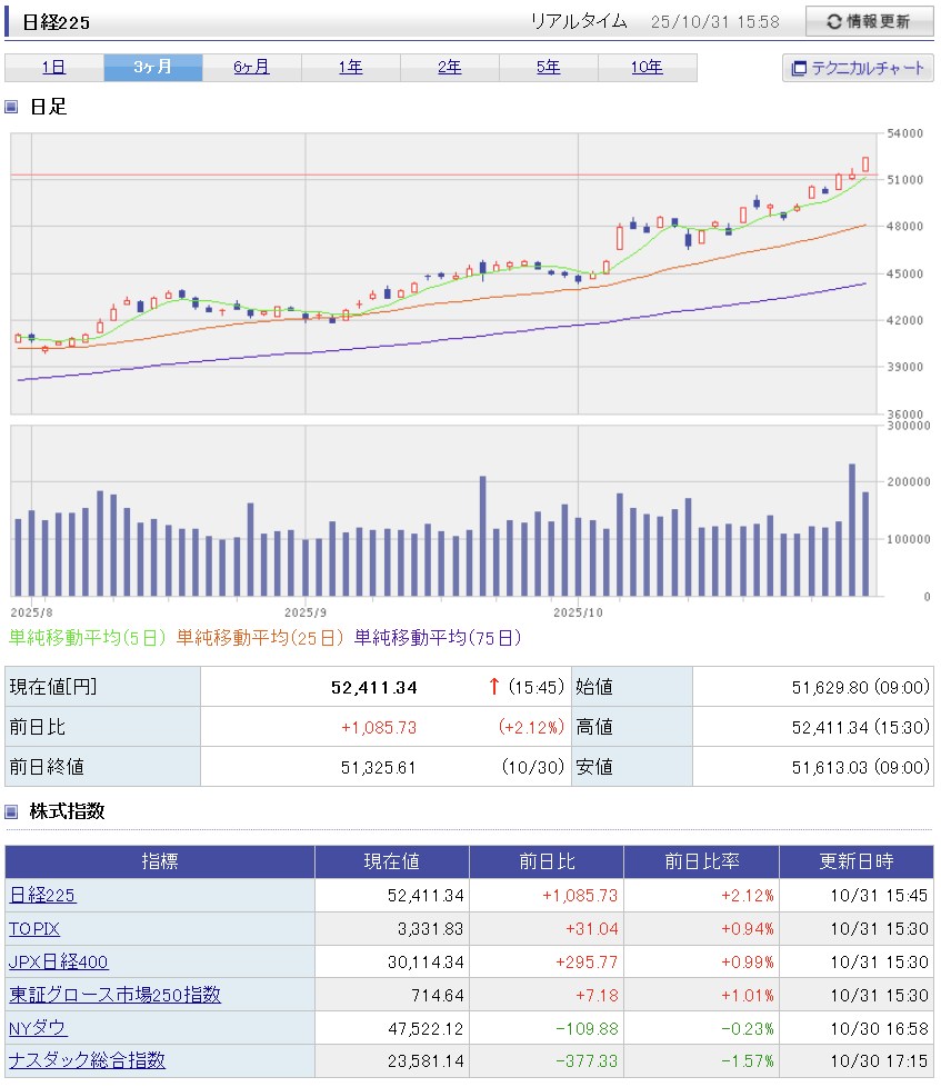 10月はハロウィンに株を買って・・・ってあるように・・・って思って月末まで様子見しながら少しづつって思ってましたが、高市さんが総裁に選ばれてから、高市銘柄がぐんぐん上げていって乗り遅れです(´;ω;`)シクシク。45000から52000まで上昇しました。これに取り残されてる人は多いハズ。ワイもそうでした。アドバン・ソフトバンク。エレクで上げた日経。それに釣られる半導体。