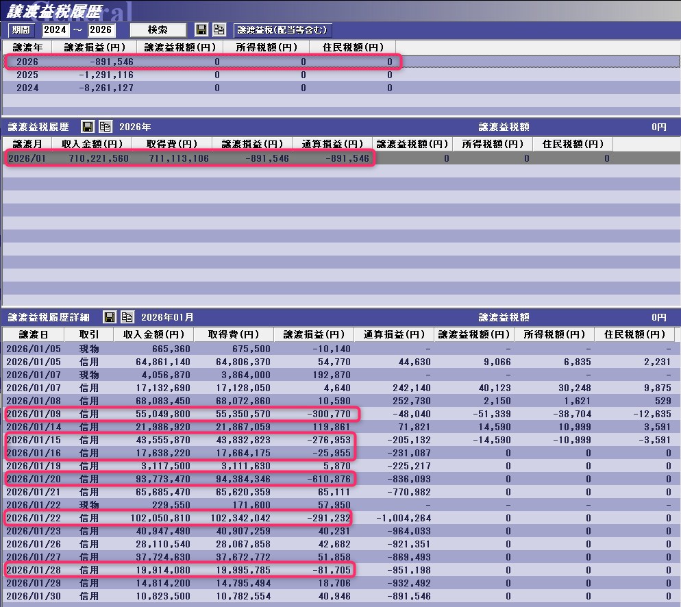 負けも勝ちも記録に残す。出ないと公平でない。負けも勝ちも意味があるものにしたいから、と前置きが長くなりましたが、2026年1月の成績は以下の通りです。マーケットスピードから画像を貼り付けてます。いきなりの大損です。▲891,546です。泣きそうです。(´;ω;`)シクシク