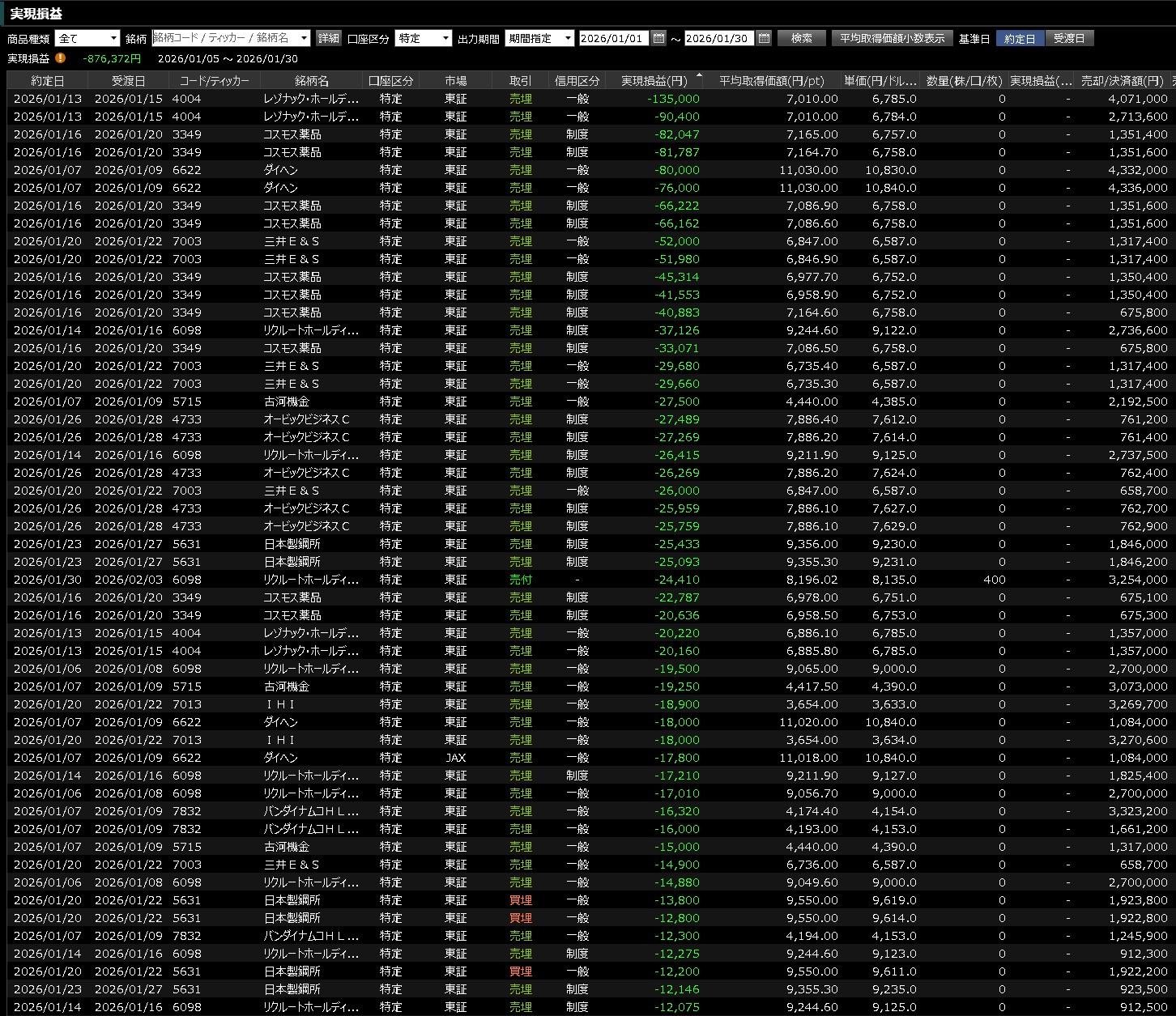 ロスカットの額をみてみると、大きなロスカットは赤枠で囲ってみました。1/9ダイヘンです。ただ、これをずっと持っていれば・・・+70万ぐらいになってました。1/15レゾナックです。これもずっと持っていれば+180万になりました。1/16はリクルート・・・