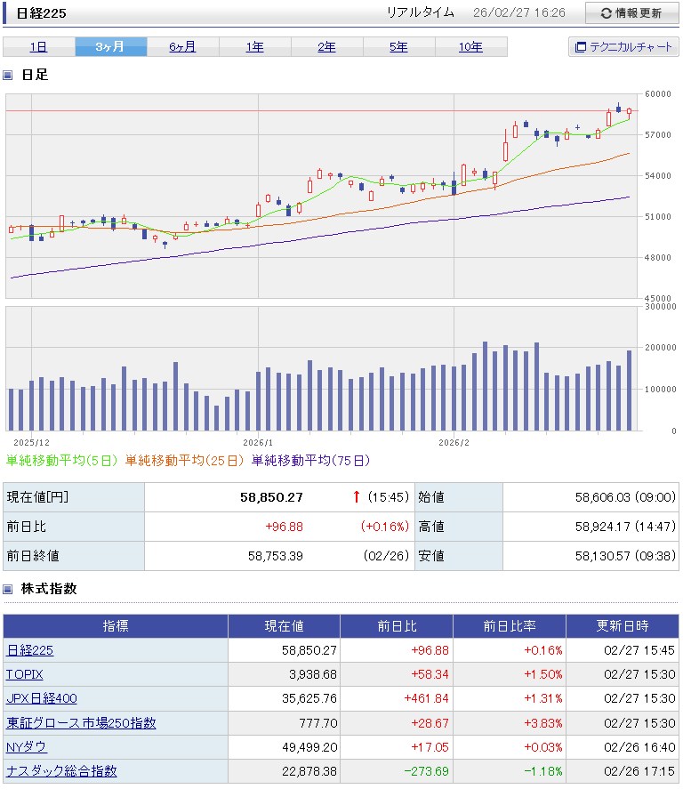 経験則と理論と勉強と・・・まぁワイは幸いなことに、経験だけは随分と積んできましたからね。あとはメンタルを鍛えないとですね。ポジポジ病にかかってる。そしてビビっている。恐れることは悪いことではない。正しく恐れてうまく相場をわたって、いずれは自分なりの聖杯を手にしたいものやで!聖杯よりも日本人なら打ち出の小槌かな!! 日経の3ヶ月チャートは以下のとおりです。2月は5000円以上日経が上げているのに全然波に全然乗れませんでしたよ。ただこれを糧にしたい。こんなにやることなすこと上手くいかなかったことはない。でもねお金が少ないときにこういった経験ができてよかったんや・・・そう思わないとやってられない(;д;)グスン