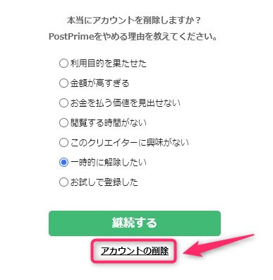 これをクリックして、出てくる辞める理由・・・いつまた入会するのか不明ですが、もう二度と無いかもですが、「一時的に解除したい」ってのを選択してアカウントの削除をすることにした。