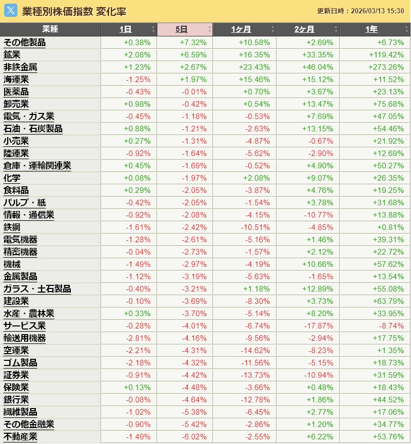 先週の業種別騰落率は以下の通りでした。任天堂が強かった。バンダイとかもね。IPが強かったんかな。あと原油高による鉱業株っすね。今週はさっぱりわからん。不動産、その他金融弱すぎやね。