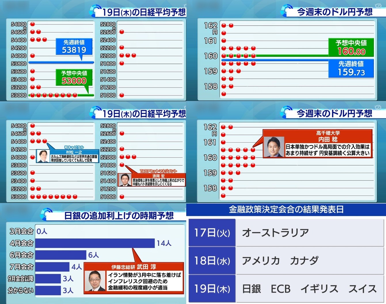 先週末の日経平均・為替のプロに寄る予想は以下のとおりです。ワイの予想は「55555@155」でしたね。大外れです。「53819@159.73」ですからね。これはアカンわ。大外れ・・・どうにかならんかな・・・イランさえ落ち着いたらなんとかなるのに・・・