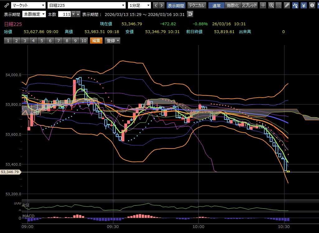 本日のデイトレ結果と日経平均の1分足は以下のとおりです。