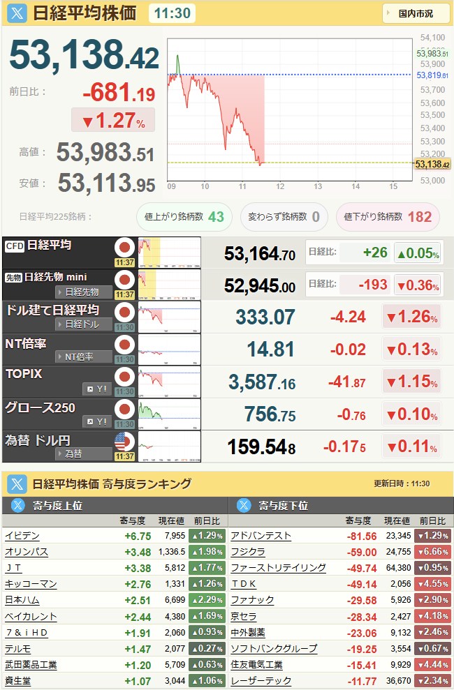 前場乙でした。含み損は30300になりました。まぁええよ。しゃーない。なんか含み益を見るまもなく落ちていきました。ワイの悪いところがでましたわ。後場はゆっくり始めます。とりあえず、治療の峠を超えたのでホッとしている。土曜日の番から気が気では無かったからね。乙でした。