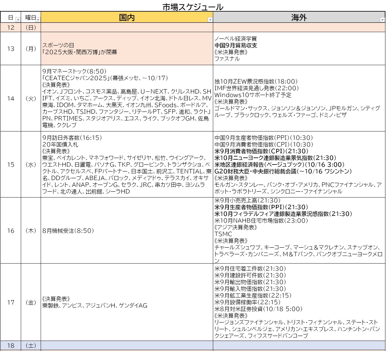 おそらく高市さんが次の総理でしょう。ただ、ワイは自民党の総裁は小泉に9割方なると思っていただけにどうなるかは全くわかりません。世の中に100%はないのです。だからギャンブルは避けるべきなんですよね。なんか世間とマスコミとの間の情報格差を感じざるえないなって思いながら今週の予定は以下の通りです。
