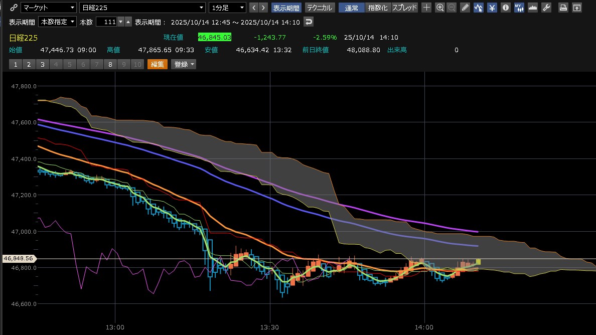 午前中は儲けてたんやで、後場のこの下落は読めなかったわ。(´;ω;`)シクシク。14:33