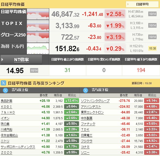 日経平均46,847.32-1,241.48-2.58%[15:30]米ドル/円151.79-0.48-0.32%[15:40]