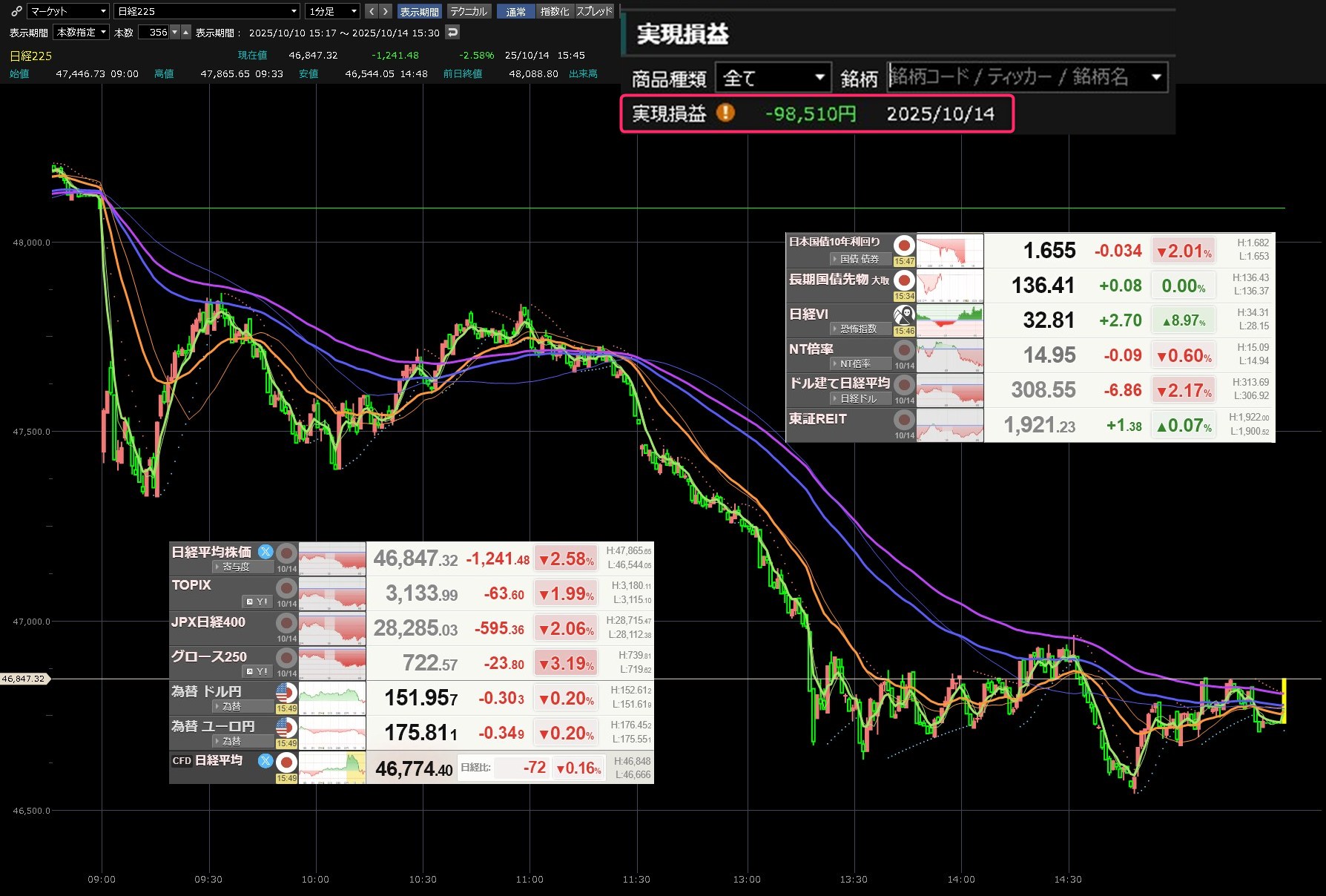本日のデイトレ結果と日経平均の1分足は以下のとおりです。