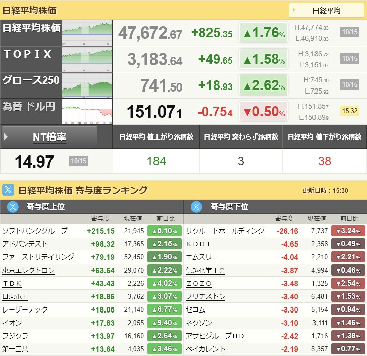 日経平均47,672.67+825.35+1.76%[15:30]米ドル/円151.03-0.8-0.53%[15:29]