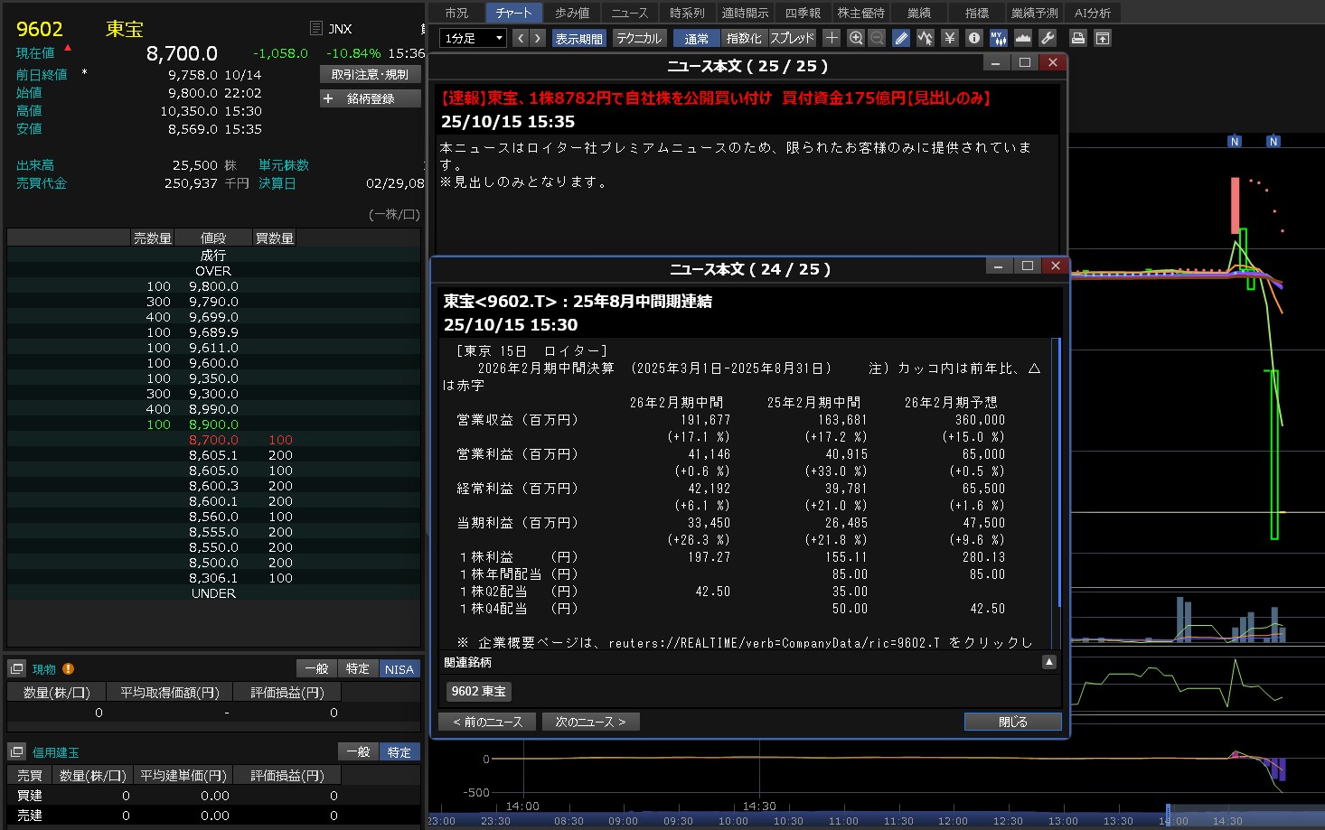 東宝が決算発表・・・えらい落ちてるやん・・・てかワイの保有銘柄ラクト・ジャパンも15%以上の下落ですわ。こんな日に資産マイナスとはね。本日も乙でした。明日も相場を楽しみます。