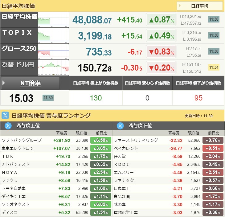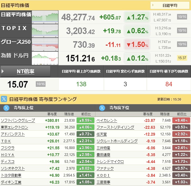 日経平均48,277.74+605.07+1.27%[15:30]米ドル/円151.07+0.03+0.02%[15:30]