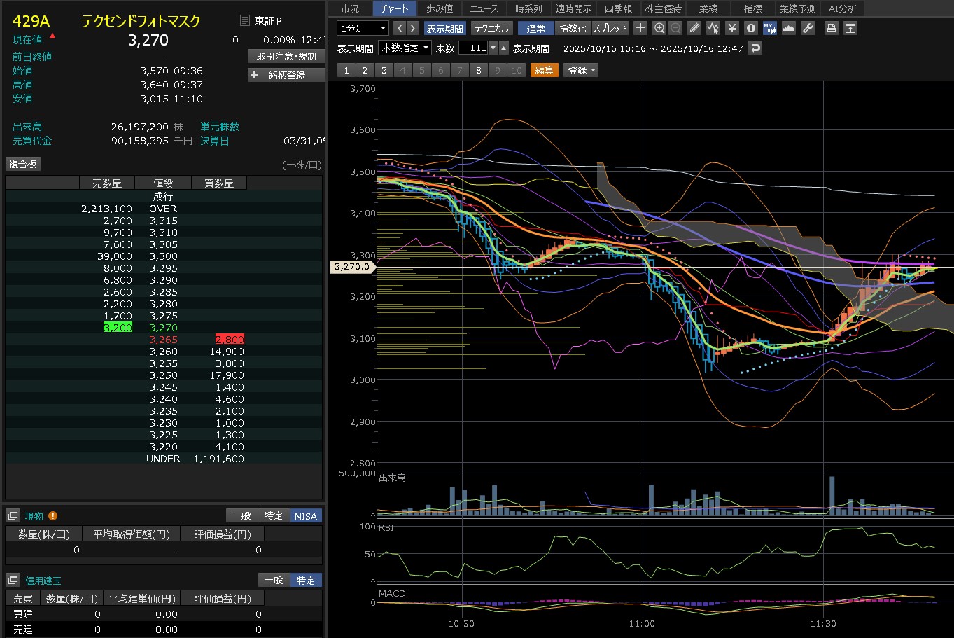 15:30が本日の安値で、今日買ったやつほぼ、みんな含み損。わいもや10万円の含み損じゃ。まさか50円も落ちるとは思わんかったわ。ホンマに迷惑や。闇鍋。ギャンブルやんけ。クソが・・・3日連続で15:30が安値です。木曜日までポジション放置で行くかな・・・