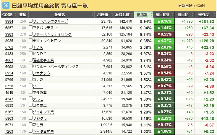 225銘柄の中でもソフトバンク、アドバンテスト、ユニクロ、エレクはちょっとあかんやろこれ・・・なんぼでも操作できよる。