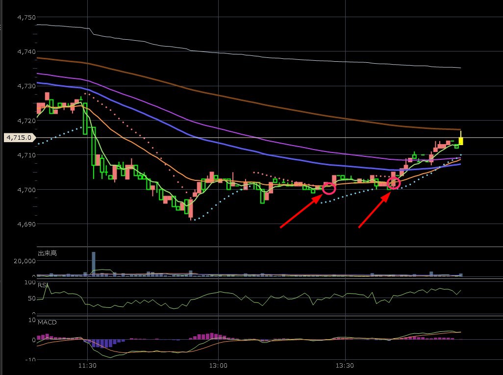 これは騙しにあった気分や。買ってませんけどね。エントリーポイントは13:20ぐらい。を考えてましたが、買わなくてよかったのか・・・もう下げトレンド・・・今日は入らないほうがいいね。
