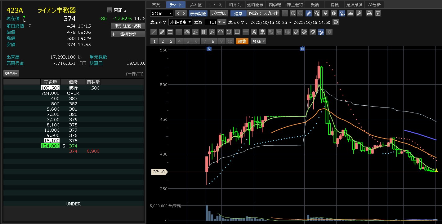 このチャートは明らかに下げトレンドでしたが、自社株買いでトレンド転換があると思ったんや。多分引けドンは何となく想像できた。デイトレ組の自社株買いで上げを期待した買い方が週末ということもあり投げたんやで!わかってたのにわかってたのに・・・何もできませんでした。