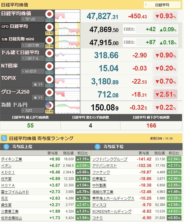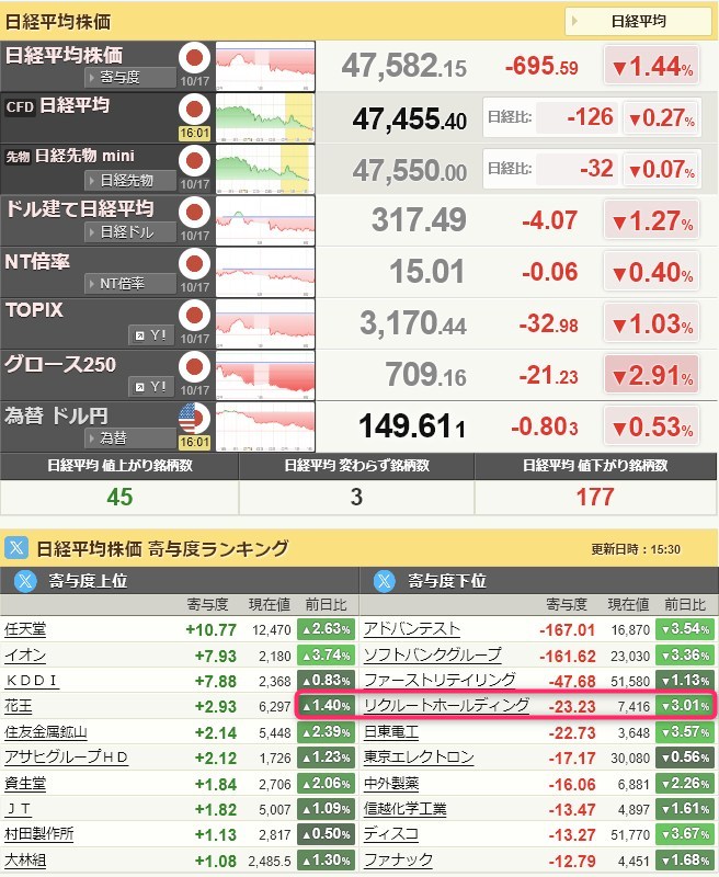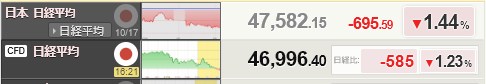 日経平均47,582.15-695.59-1.44%[15:45]米ドル/円149.43-0.99-0.66%[16:20]