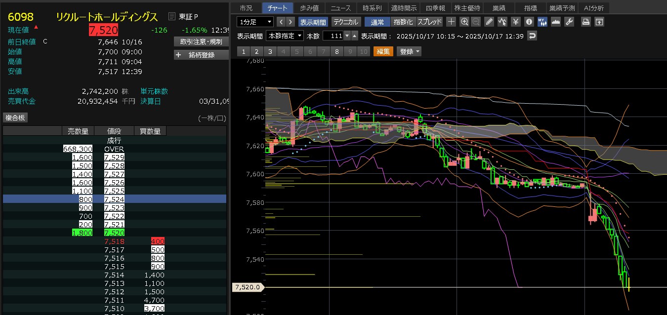リクルートって5日連続の下げやんか・・・4日連続がなかなかないのに、5日連続ってね。8.2%下げてるよ。ってことは月曜日は上げやろ。知らんけど・・・ホンマにクソ株下げる株落ちるナイフ鋭すぎる。大出血やで!追加購入するのか悩むところ。なんとなく、週明けは上げそうな気がするねん。下げ材料ではないやん。自社株買いって!せめて引けには7500には回復して欲しい。