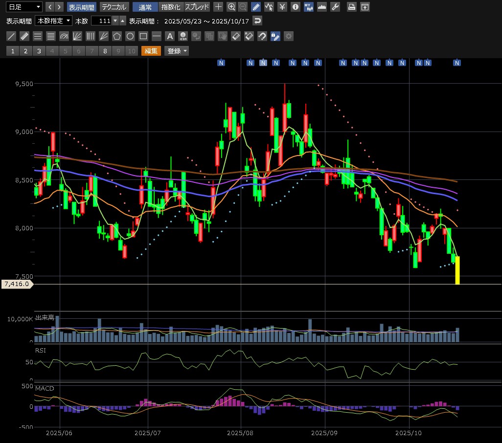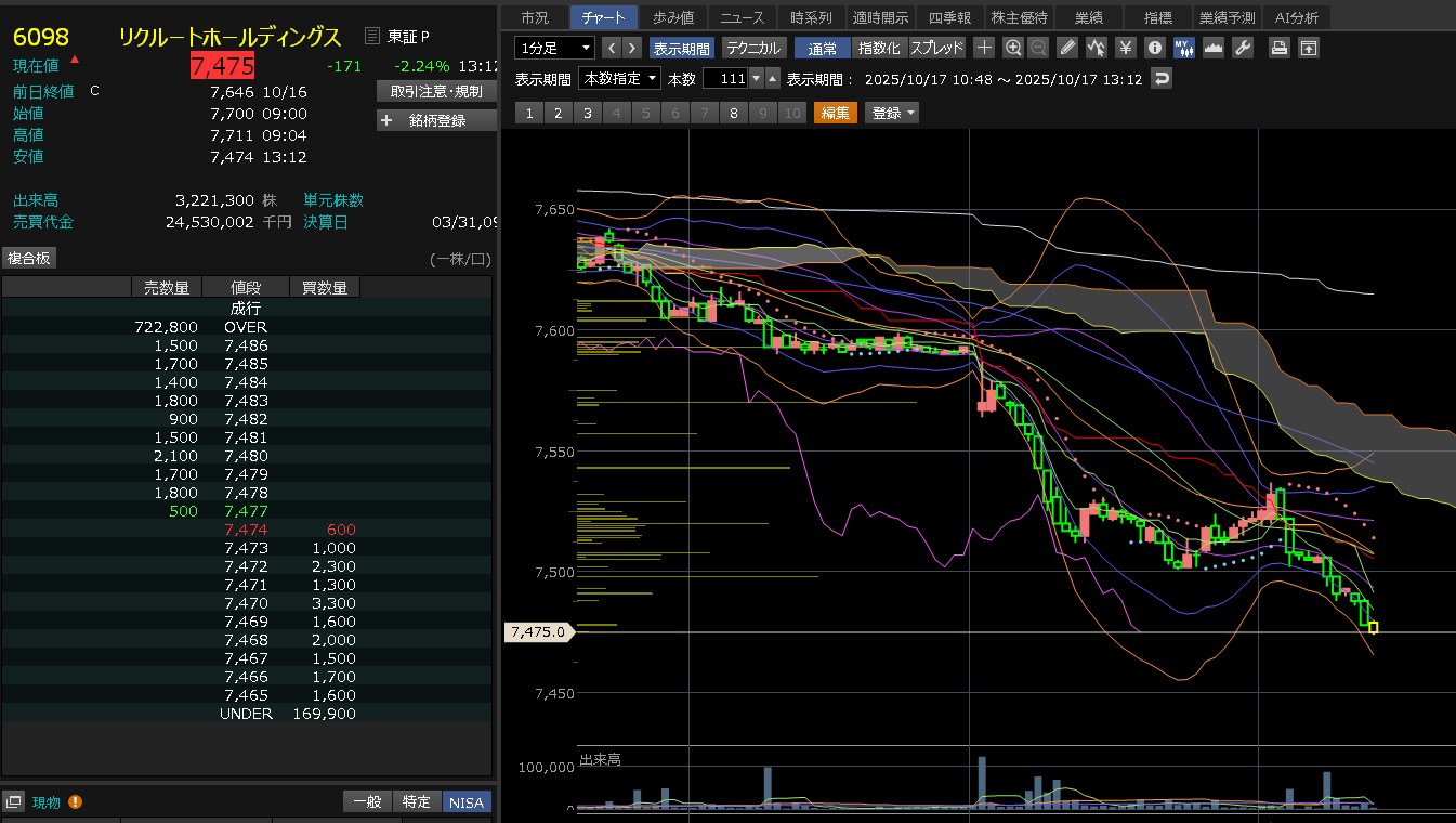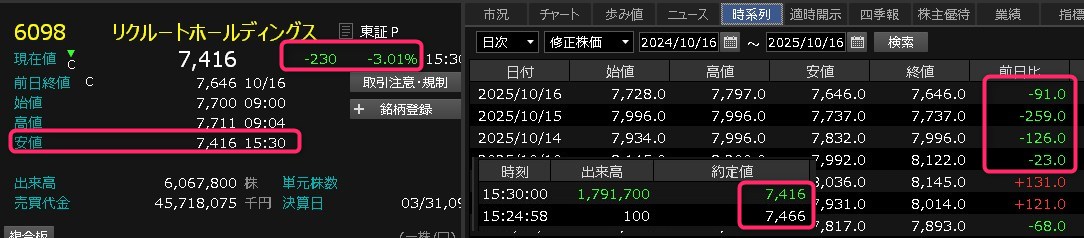 こんなことってある?5日連続の下げ・・・8145から5営業日で7416って・・・プライム日経225銘柄のリクルートがこのザマです。自社株買いを発表してこのザマです。