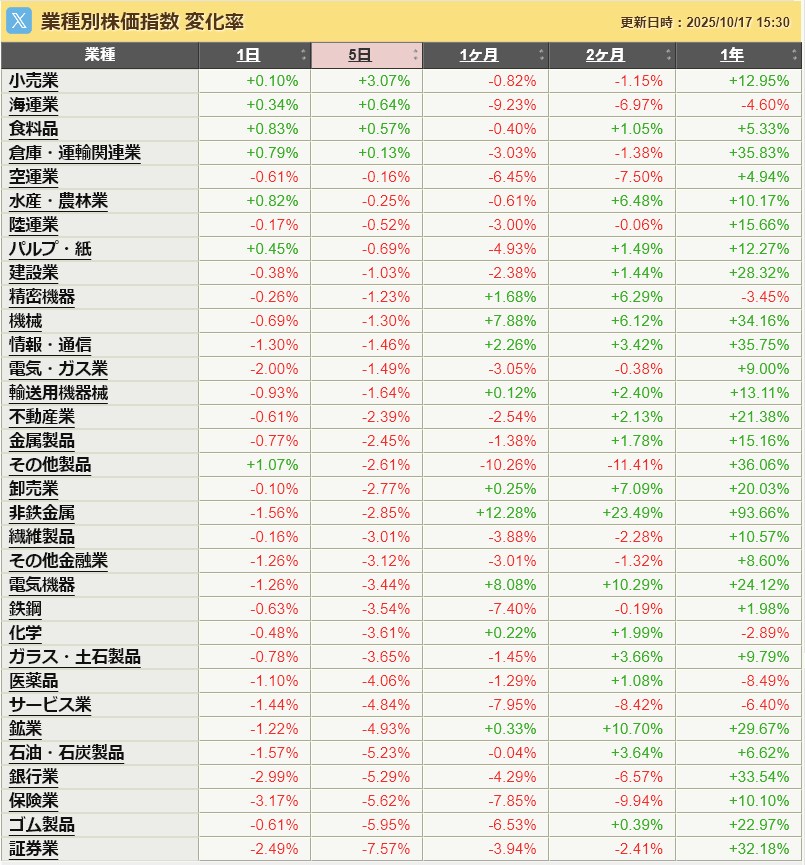 ちなみに先週の業種別騰落率は以下の通りでした。証券業がボロボロでしたね。