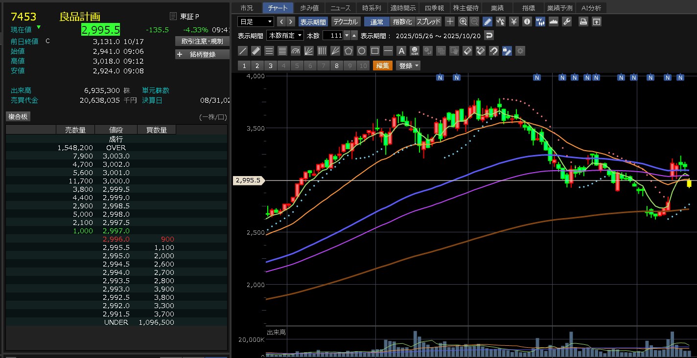 @7610で処分しましたが、現在@7670ですよ・・・1000株でしたからね。これはもったいないことをしました。でも▲10万でしたからね。贅沢を言ってはいけません。もともと下降トレンドでしたし、ここで買いに向かったらあかんねんな。知らんけど・・・