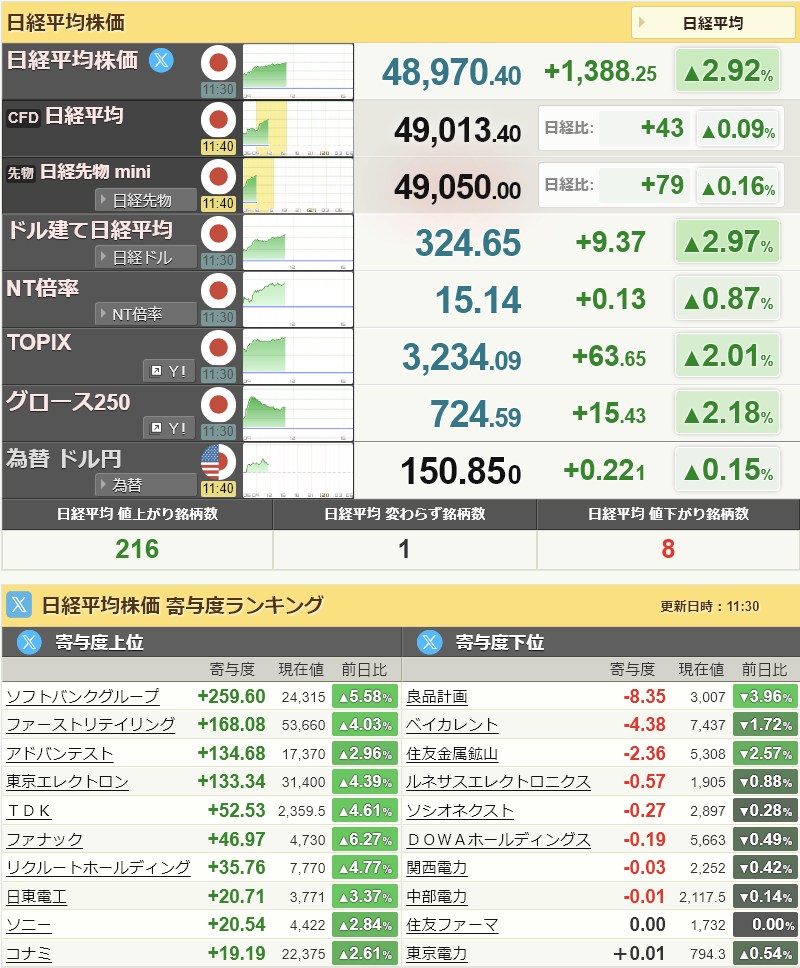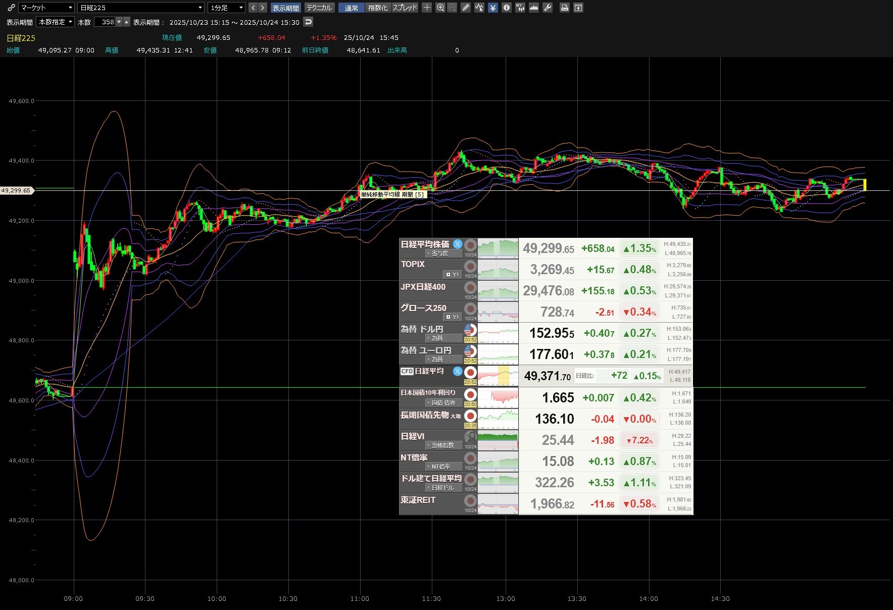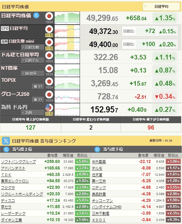 日経平均49,299.65+658.04+1.35%[15:45]米ドル/円152.91+0.33+0.22%[20:40]