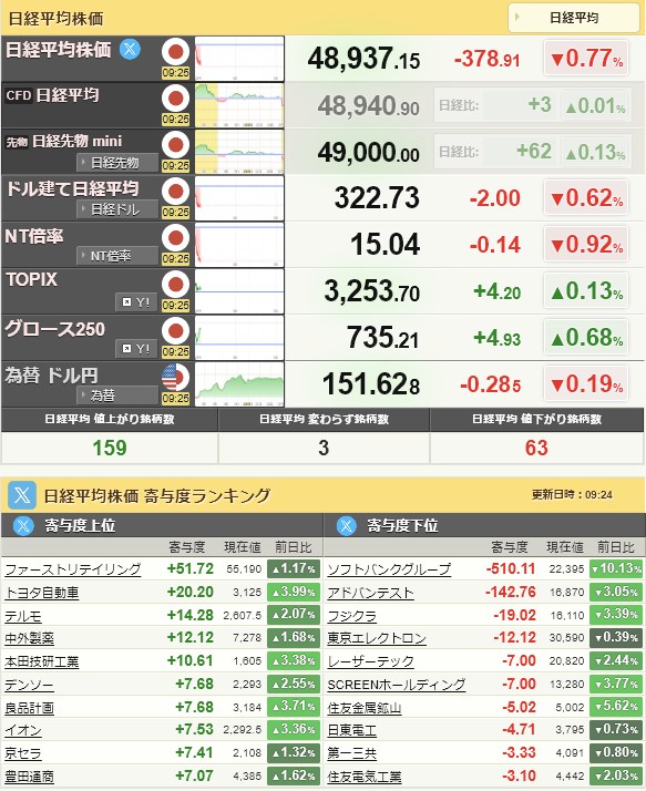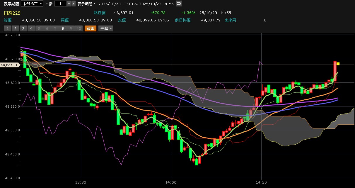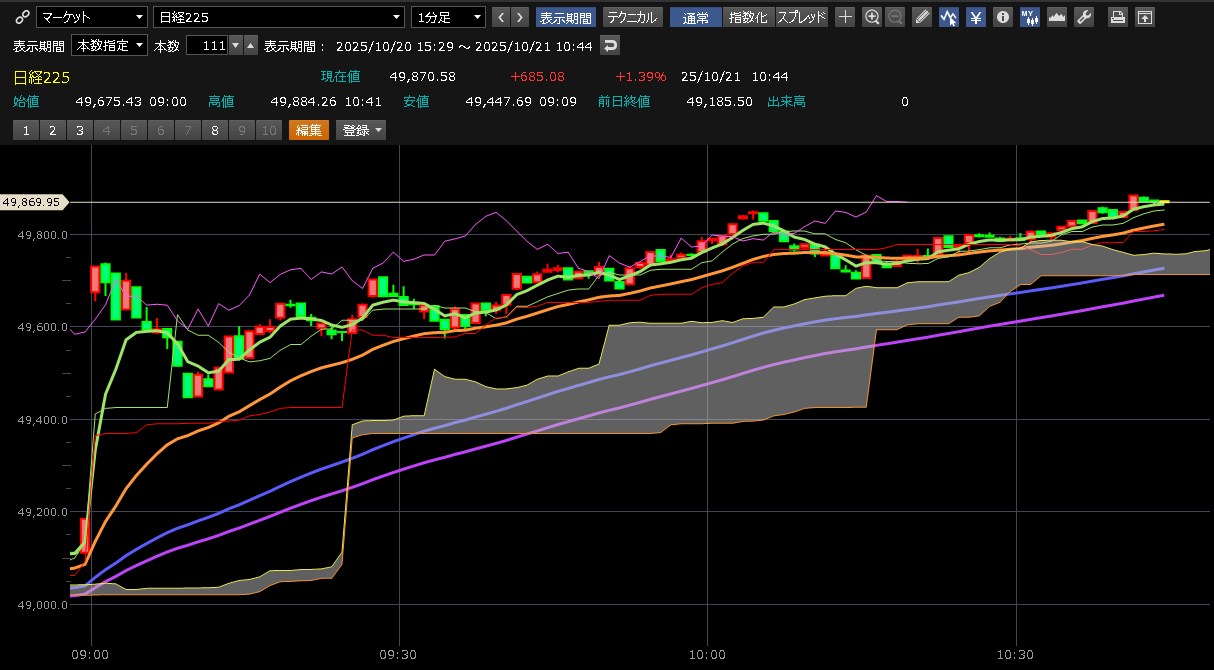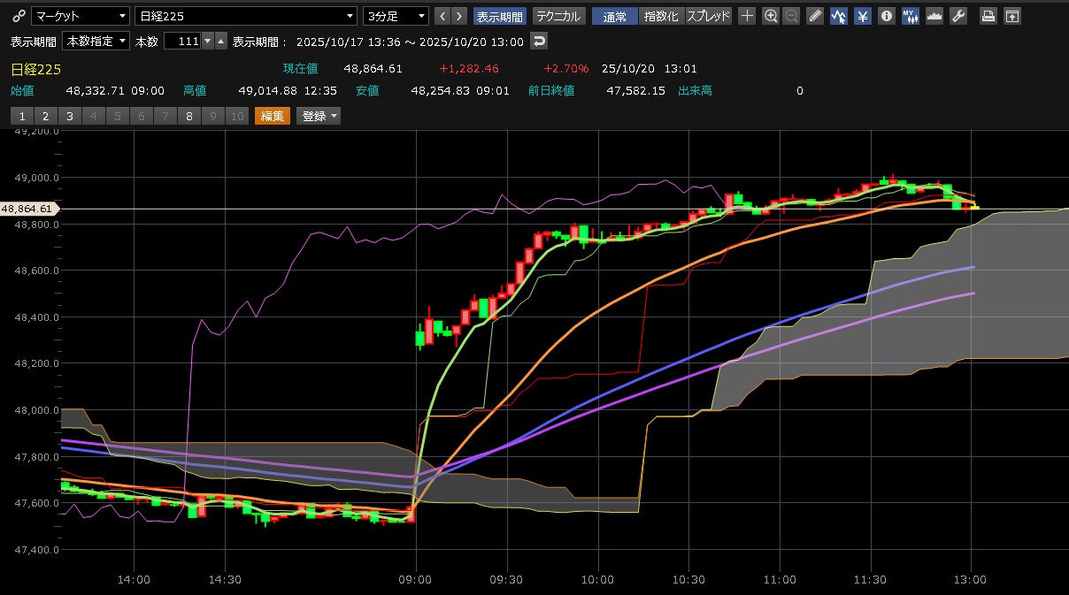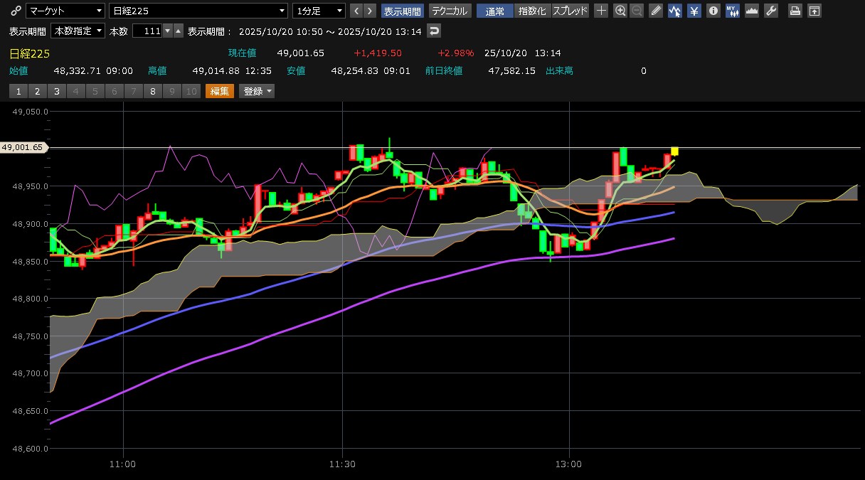 前場が終わってCFDが49000超えとるやん。もう押し目がない今日の相場です。難しいわ。一方通行やん。今日は買いで何処まで行くかやね。前場乙でした。ノーポジです。