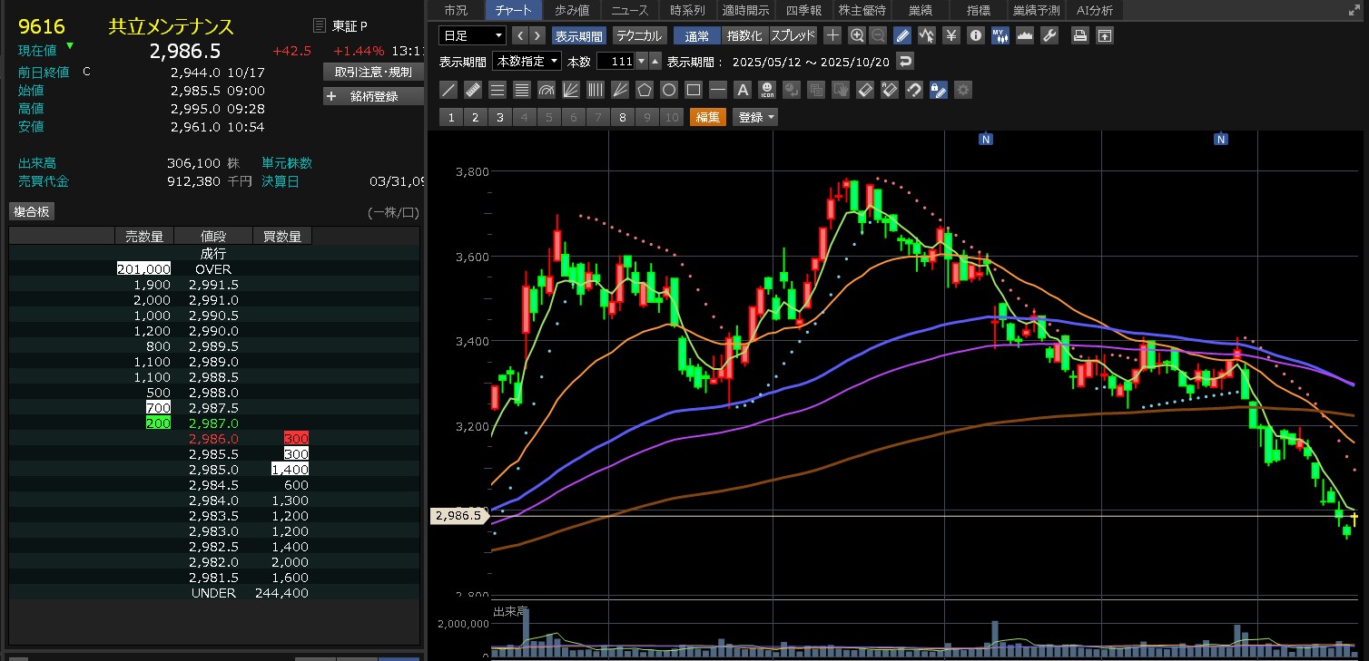 共立メンテっていい会社やのにずっと下降トレンドなんやね。今日は上げてるけど、これはね・・・なんかワイは掴んでしまってそうで怖い。こういう株もあることを覚えとかんとあかんね。上場来高値をマークしてからずっと下げてるもんね。この手の出来高の銘柄は期間がなんとでも操作できるからホンマに怖い。