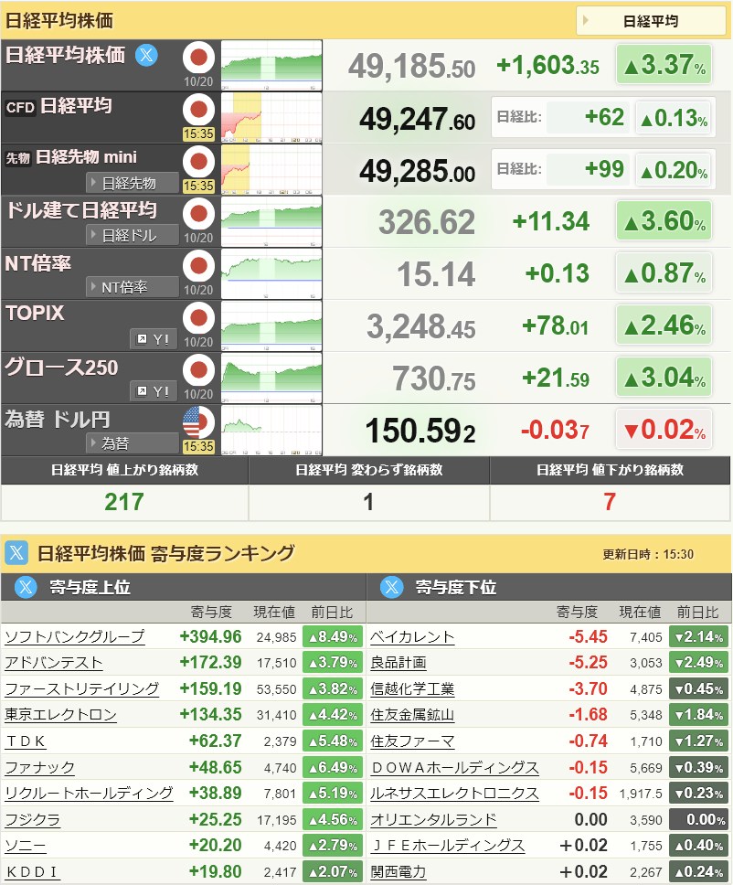 日経平均49,185.5+1,603.35+3.37%[15:30]米ドル/円150.66+0.11+0.07%[15:30]
