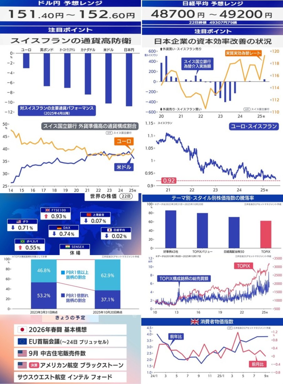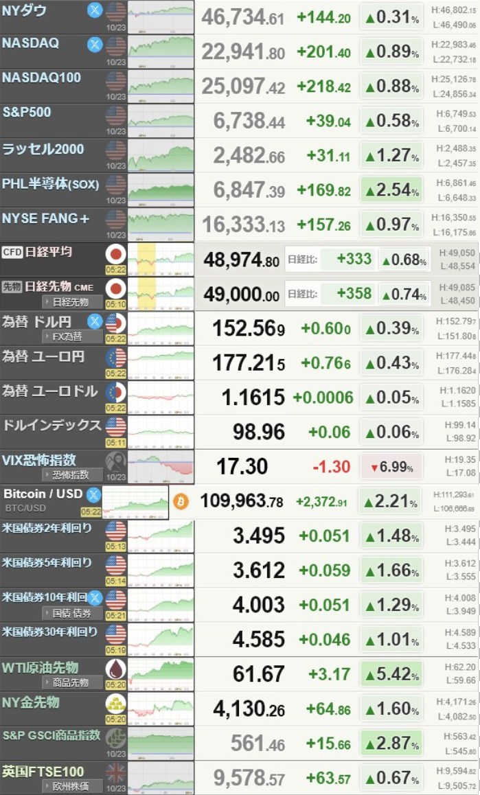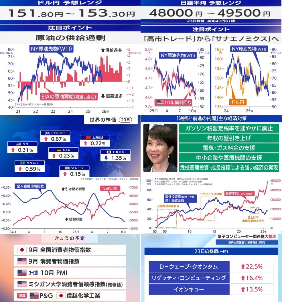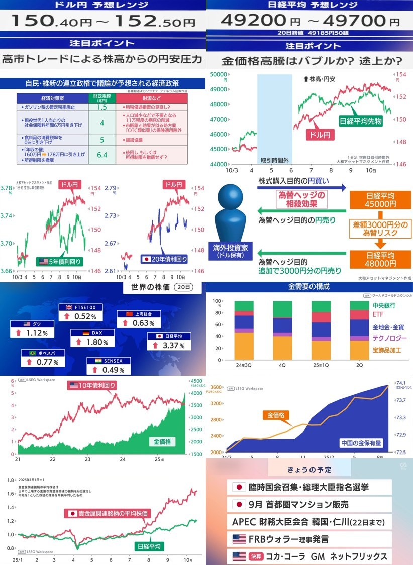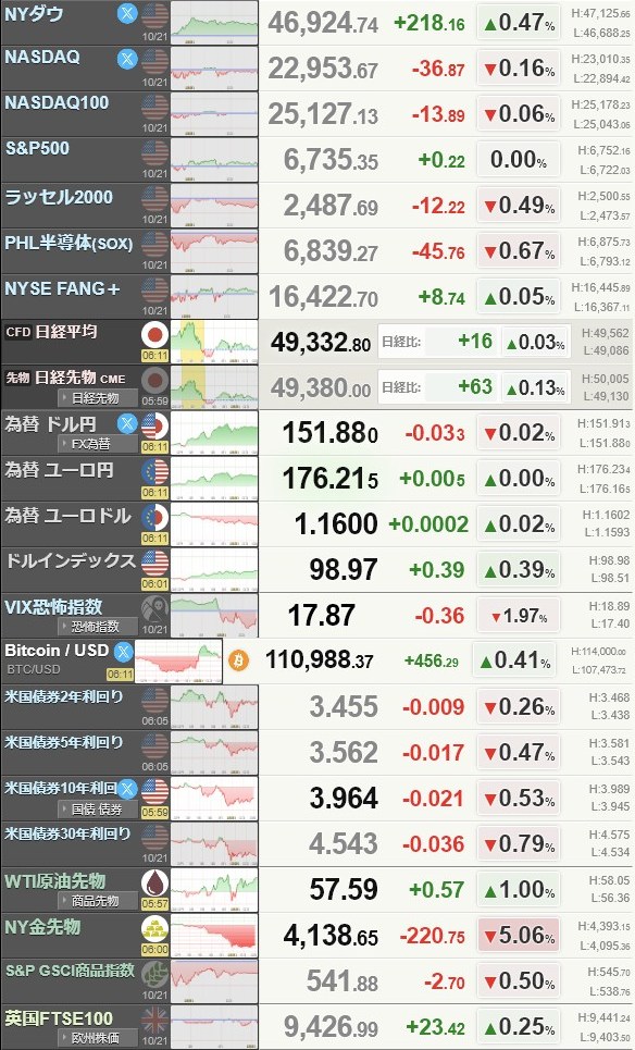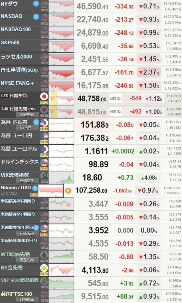 さて、高市政権がスタートします。マスコミによる大バッシングが始まりそうですね。ただSNSなどでテレビしか見ない層は騙せてもSNS層は自分で考えて行動するようになっているので、今後テレビは廃れていくのかななんて思いながら、米市場の結果と本日のレンジ・予定は以下のとおりです。