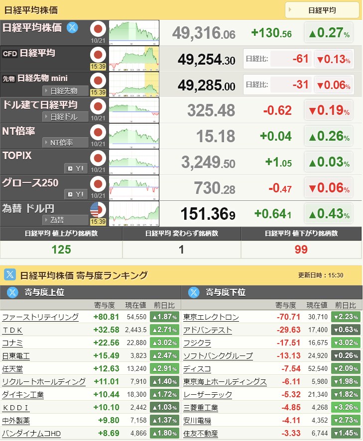日経平均49,316.06+130.56+0.27%[15:30]米ドル/円151.57+0.83+0.55%[15:29]
