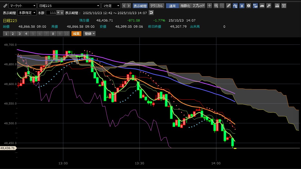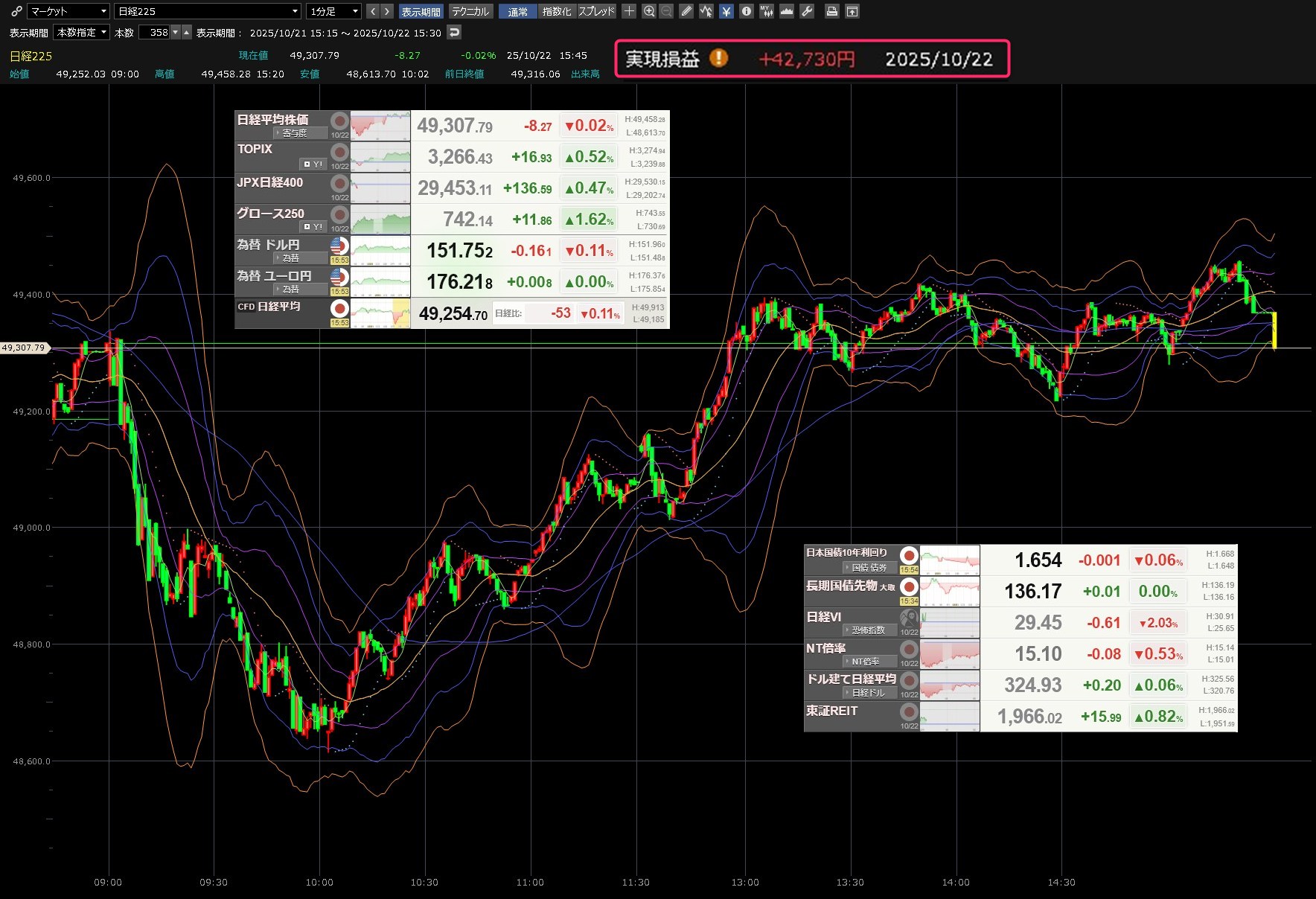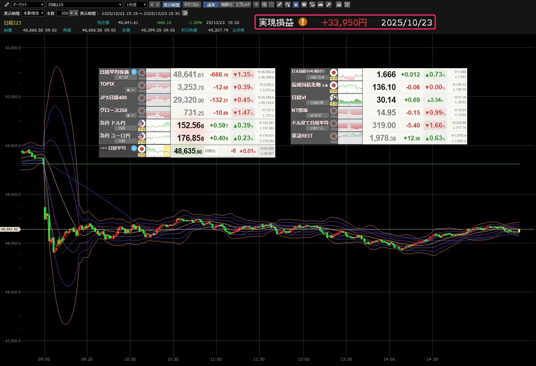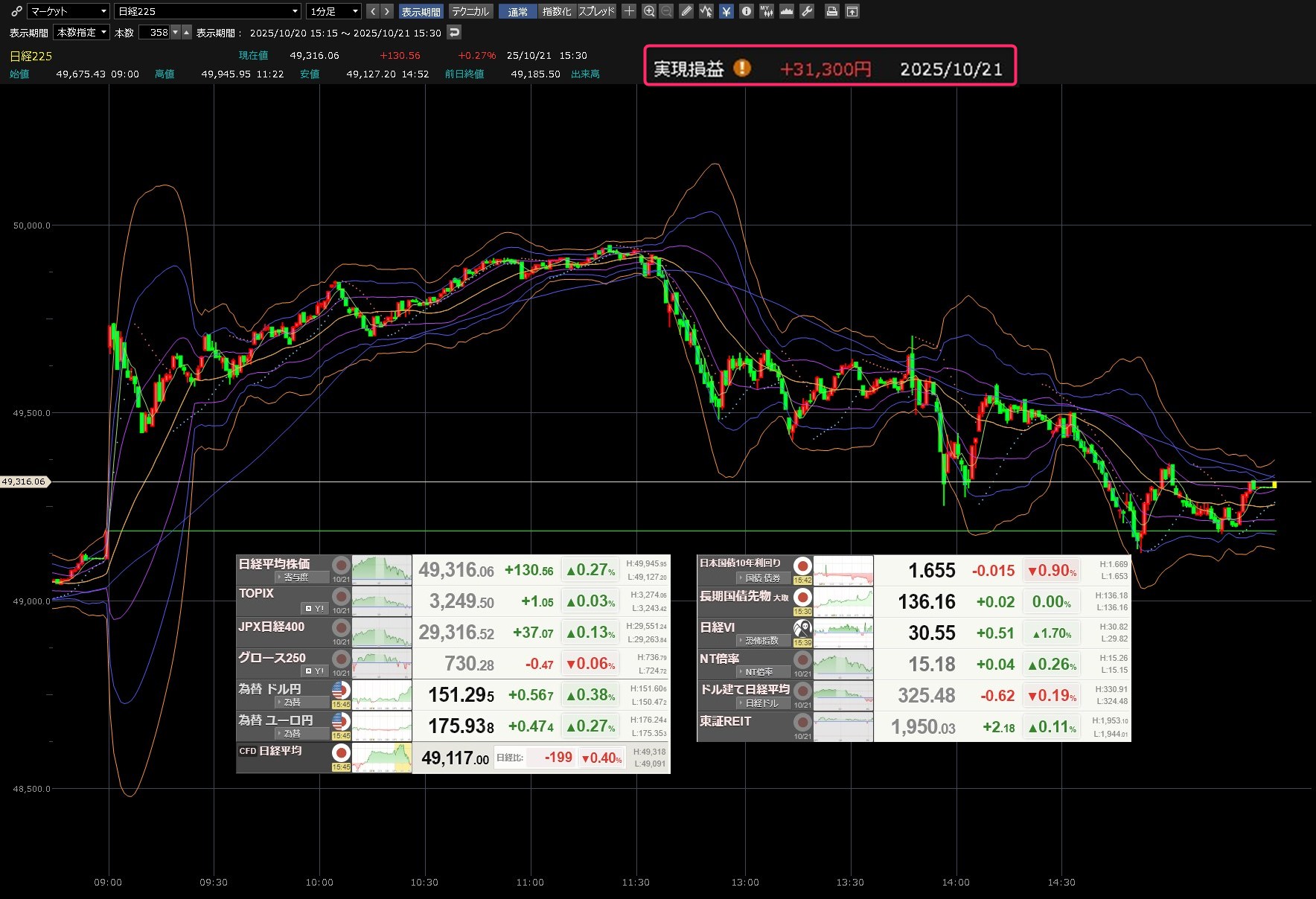 本日のデイトレ結果と日経平均の1分足は以下のとおりです。