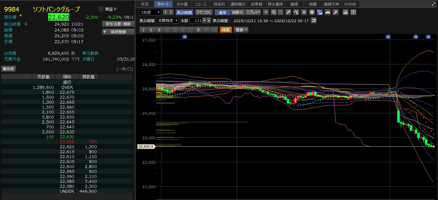 結局ソフトバンクかよ。ワイが上がりそうって書いたらどんどん下げてった。1分しか経過してないのに22485ってね。アホかよ。