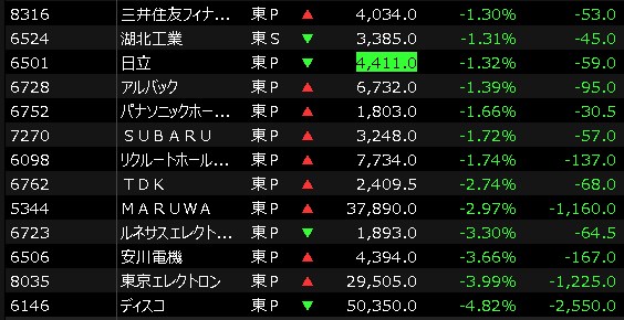 前場乙でした。今日は四天王が足を引っ張ってるね。四天王だけで440ぐらい日経を押し下げてるんですかね。ってことは今日は純粋に日系弱いって言うことやね。
