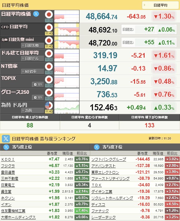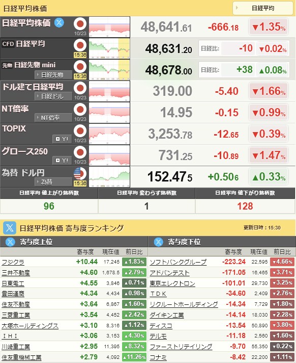 日経平均48,641.61-666.18-1.35%[15:30]米ドル/円152.4+0.43+0.28%[15:30]