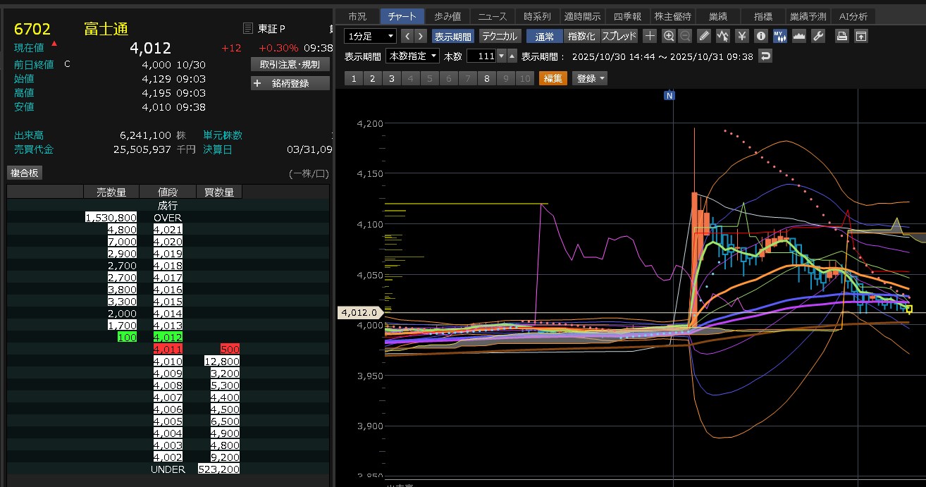 富士通は前日上げすぎたんかな。下げとるやん。買った人ほとんど含み損。持ち越した人だけが勝ち組ですね。こういうこともあるから日立買えなかったんや・・・ちょっと富士通は近づけないな。