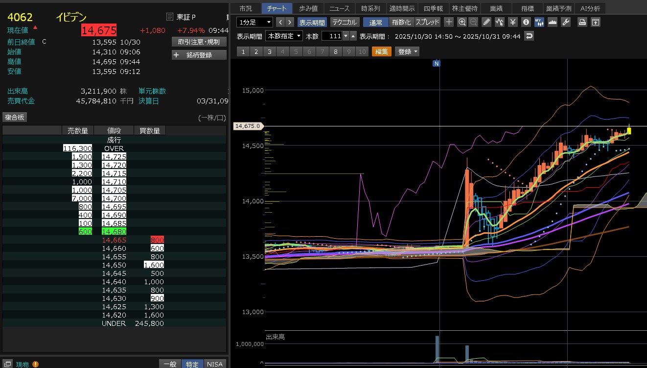イビデンしくじったわ。ホンマにしくじった。こういうチェックしないと行けない銘柄をよく見とかないとですね。完全に見落としてました。13700ぐらいでワイは入ってたで!もちろん、本日中に処分ですけどね。今日は引けに入れ替えに伴う買いが入ると思うんや。反対に、引けにニデックは買いなのかも知れない。知らんけど・・・イビデン・・・何処まで上がるんや・・・14800超えたぞ・・・これは15000行くパターンやね。