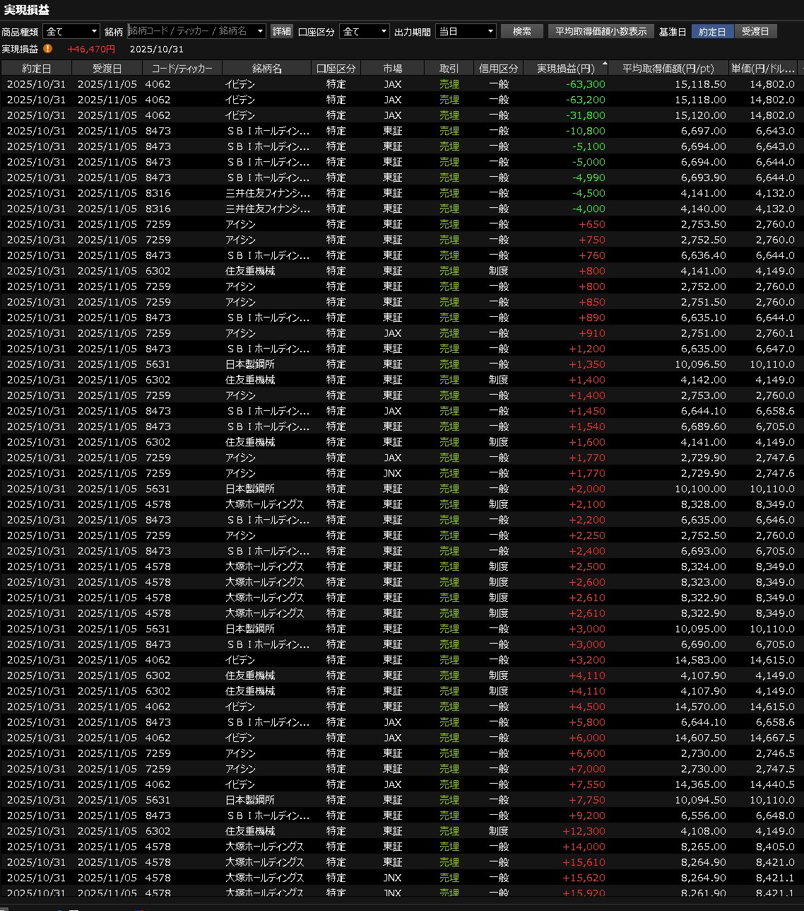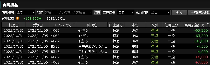 終わりました。ワイの取引も終わってしまいました。読みが外れた・・・今日の取引は以下の通り・・・