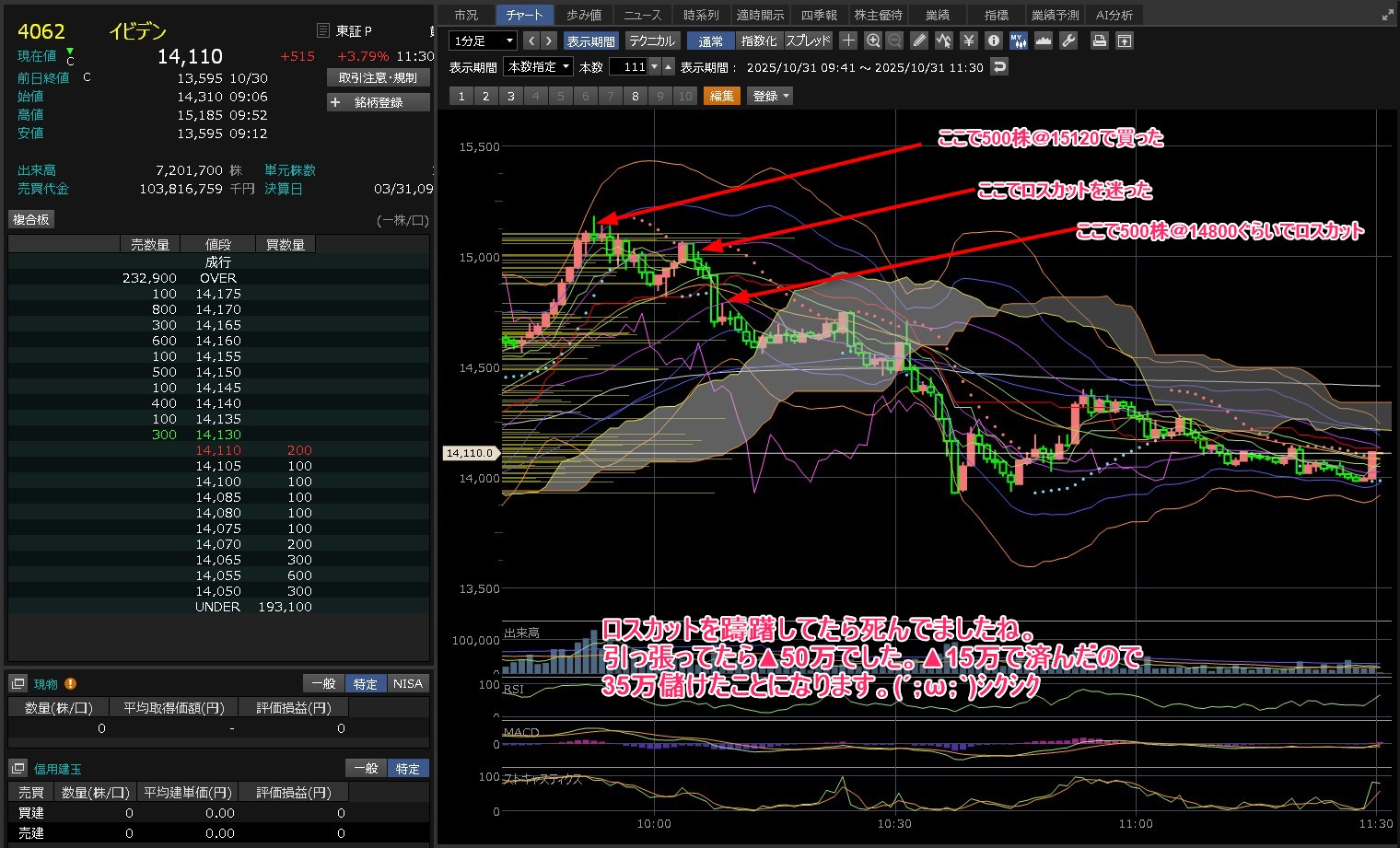 話題株は入るタイミングを誤るとあかんな。今回は明らかワイのミスや。イビデン・・・クソかよ。今日はここに手数料2200が乗ってきますからね。もう最悪ですわ。落ちるのが早くて・・・15万のロスカットです。あぁくやしぃいいいいいいいいいいいいいいいい