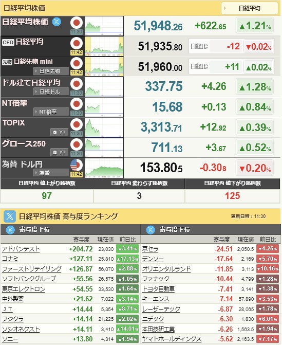 日経平均51,307.65+1,088.47+2.17%[15:30]米ドル/円152.28+0.18+0.12%[15:30]
