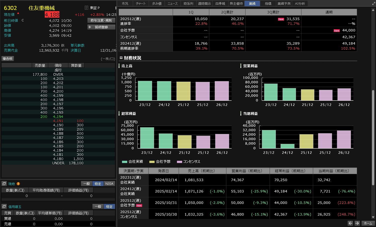 底値で買えましたが、すぐに売った。本来は売ったところが買いサインが出ているところ。これは失敗。上昇トレンドの始まりやったんとちゃう?知らんけど・・・現在@4368やったわ・・・完全にやらかした。@4351でうってるんやもん・・・まぁ500株だけですけどね。今日はちょっと住友重機下げ過ぎとちゃいますの? 造船、半導体、防衛って高市テーマ結構カバーしてる銘柄やのになんでなん?他の造船銘柄ってほとんど上げてるで!