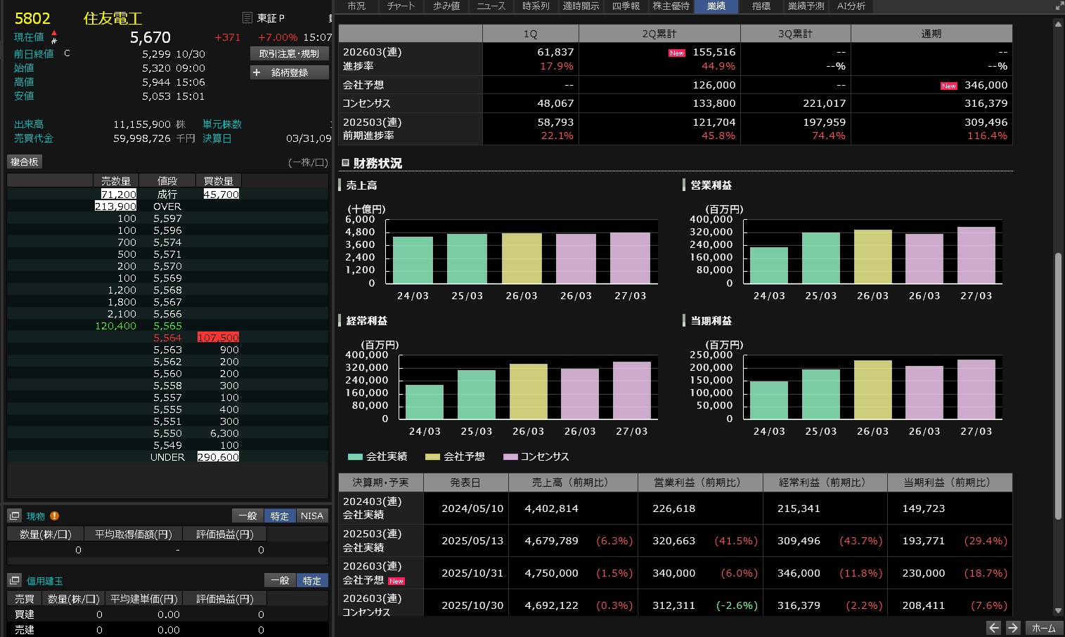 ちょっと含み損で捕まったな。住友電工乗り遅れた。もう買えない・・・(´;ω;`)シクシク なんでこんなに上げるんや。意味不明やわ。通期コンセンサス以上やからかな。