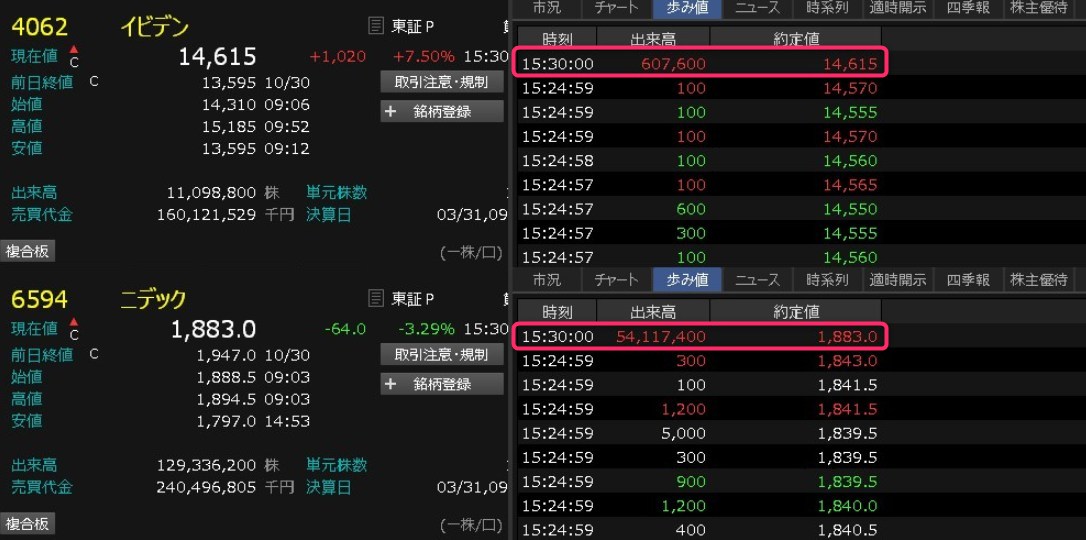 ちょっと想像と違った。もっと出来高あるかなと思ったんですけどね。イビデンのほうね・・・ニデックは半端ないわ。最後に5000万株ってね。すごいわ。