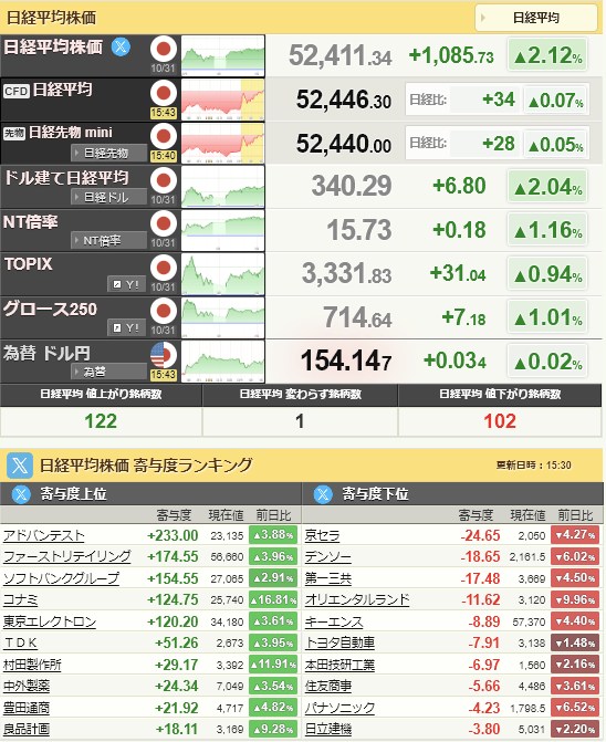 日経平均52,411.34+1,085.73+2.12%[15:30]米ドル/円154.06-0.06-0.04%[15:39]