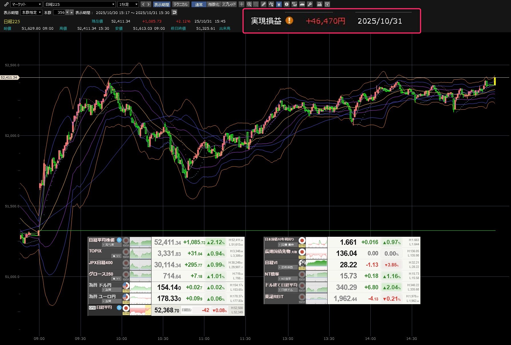 日経が5万円突破しました。おめでとうございます。日本の未来は明るい。なんて思いながら、本日のデイトレ結果と日経平均の1分足は以下のとおりです。