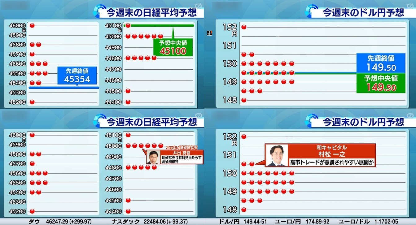 そして、先週のプロの予想が以下の通りです。先週は「日経44900@148」と予想していました。今回も大外れです。なかなか最近は難しいですね。