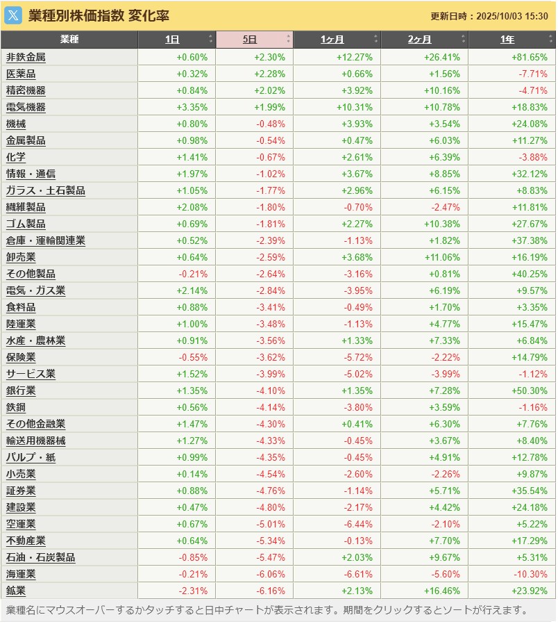 ちなみに先週の業種別騰落率は以下の通りでした。今週は高市銘柄が上がるのかな?日本の経済を強くする産業に注力してくれそうだから・・・でも東京エレクトロンの大株主にはTBSがいるんですよね。