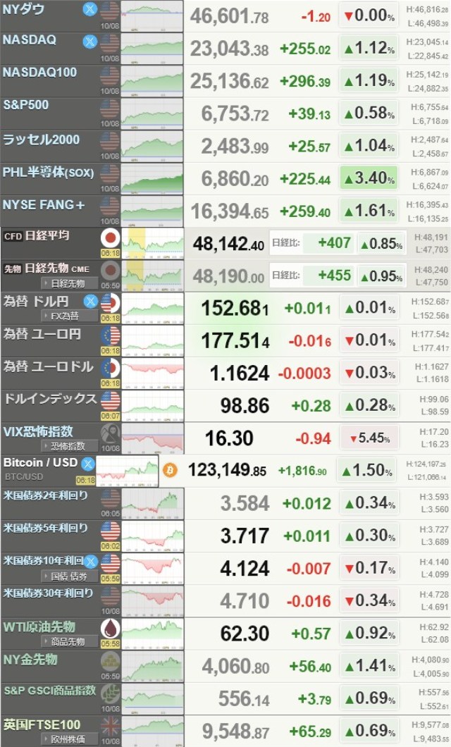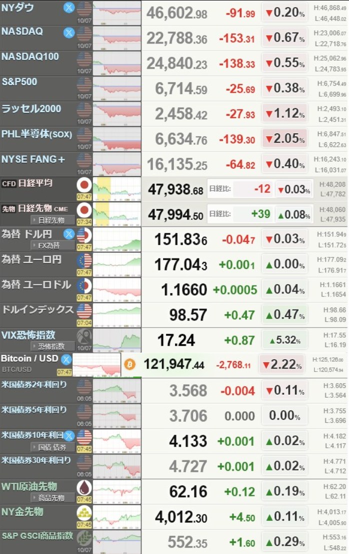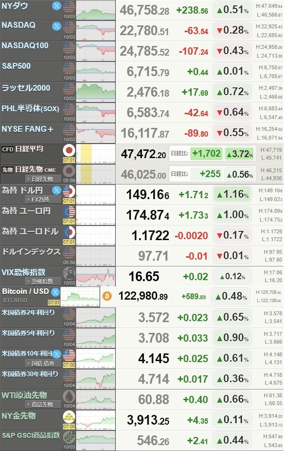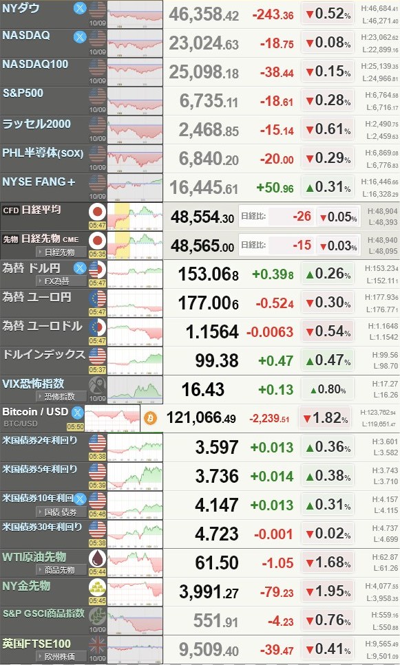 ぶっちゃけここまで上がるとは思わなんだ。高市さんは仕事ができるからいろんな分野に手を出しているから高市銘柄っていうのが多いねんな。だから幅広く上昇したのでしょう。ワイは完全に乗り遅れ・・・(´;ω;`)シクシクなんて思いながら米市場の結果と本日のレンジ・予定は以下のとおりです。