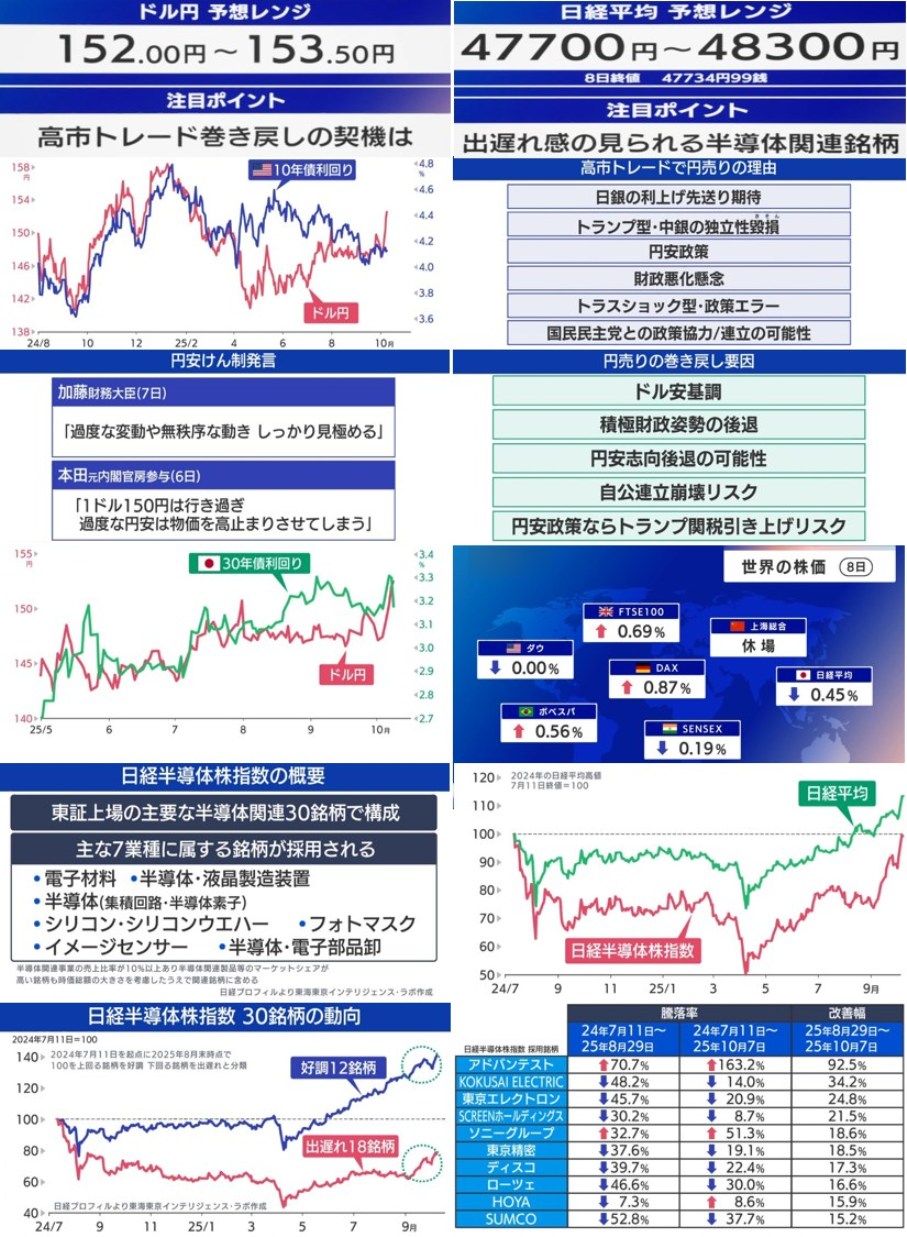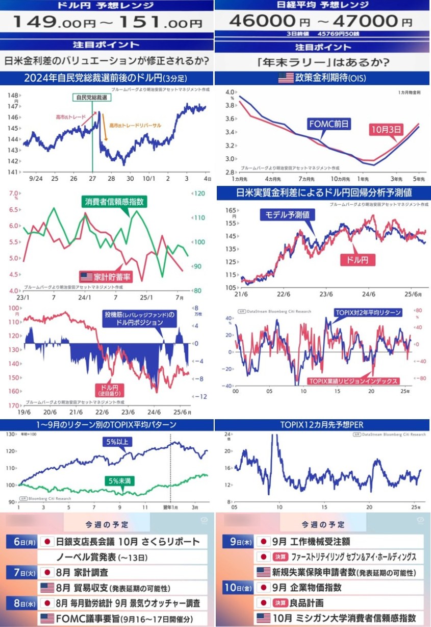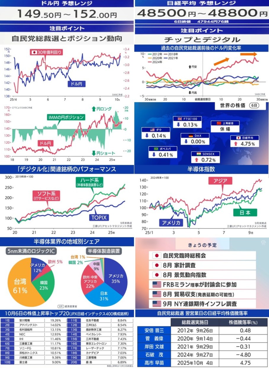 さて、高市さんは女性初の総裁おめでとうございます。トップになりたかっただけの石破とは覚悟が違いますね。今まで甘い汁を吸って日本を後退させてきた国会議員は馬車馬のように働かないとこの国を持ち直すことはできませんよ。さっそく馬車馬という言葉に飛びついている馬鹿な政治家が何人かいますが、これに飛びつく政治家は楽をしてきた政治家でしょうなんて思いながら、今週末の日経平均・為替のプロに寄る予想は以下の通りです。